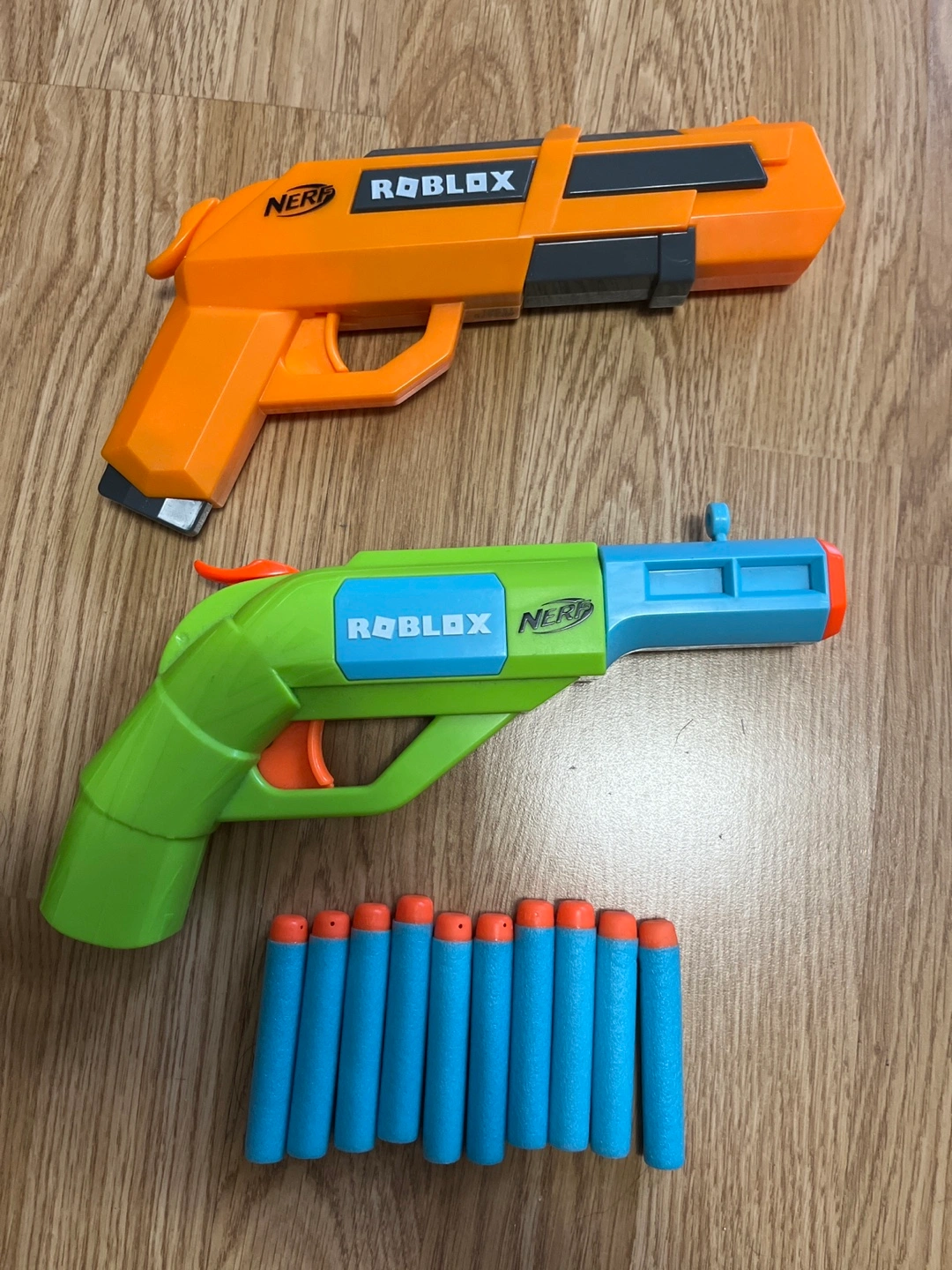 Selling a pair of Nerf Roblox dart guns! One is orange and the other is green and blue. Includes a bunch of Nerf darts, ready for some fun!