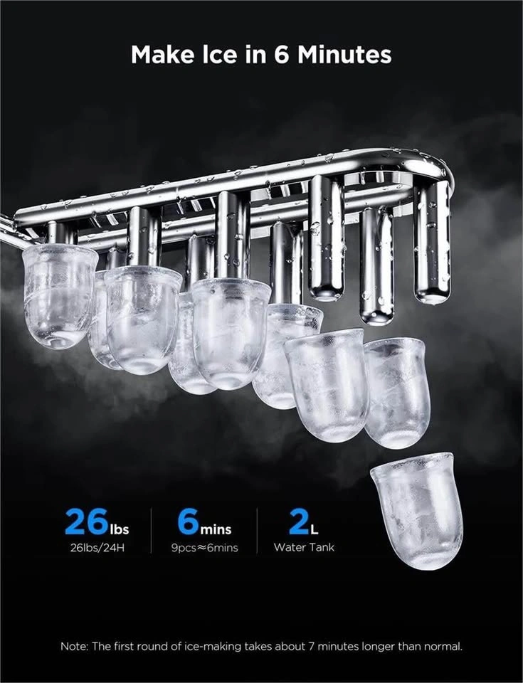 Smart countertop ice maker with built-in Wi-Fi and voice control (Alexa/Google Assistant compatible). Pair with the app to monitor status and schedule ice making. Makes 9 bullet ice cubes in about 6 minutes. The 2L water tank can produce up to 26 lbs of ice in 24 hours. Features an efficient self-cleaning function (10-minute cycle, customizable via app). Choose from 3 ice cube sizes (small, medium, large). Includes a 1.5 lb portable ice basket. The RGB ice basket shows ice status and water levels with customizable colors (beeping alerts can be turned off in the app). Easy scheduling via the app for automated ice making. Please note: this ice maker does not have a cooling function. Package includes: Smart ice maker, magnetic ice scoop, portable ice basket, and English instruction manual. ETL certified.
