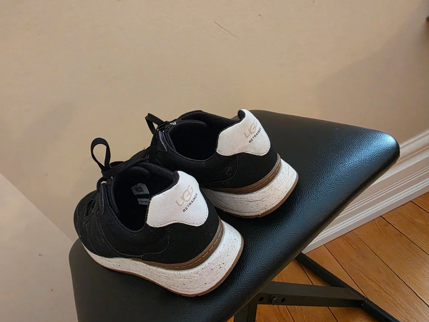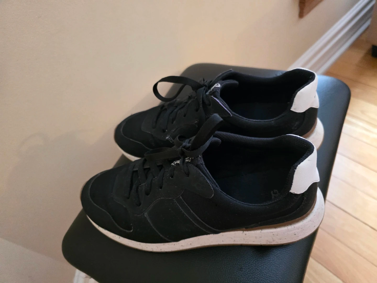 These UGG "Realtrainer" sneakers are black with white accents. They're designed for comfort and style. Perfect for everyday