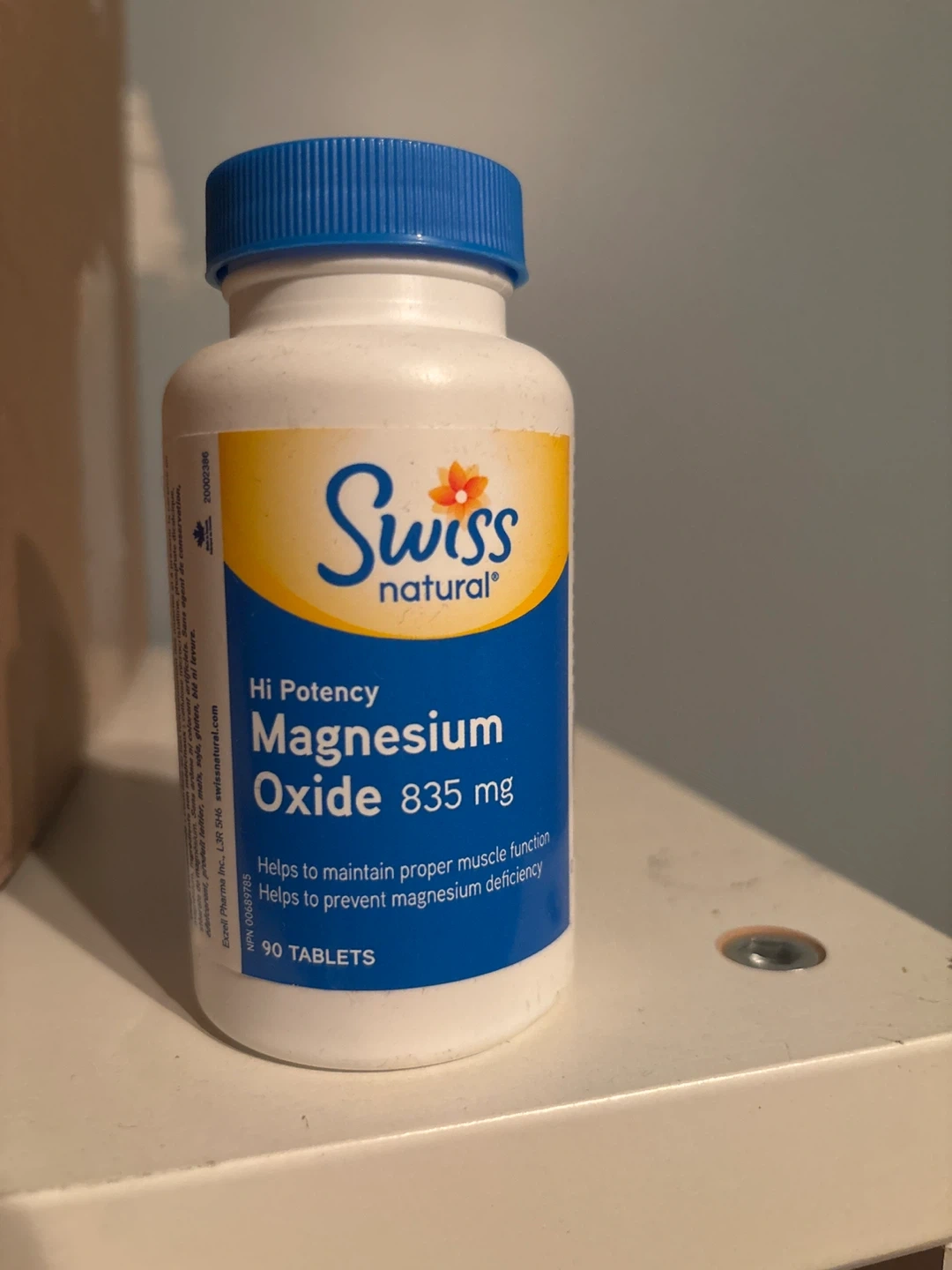 Selling a new bottle of Swiss Natural Magnesium Oxide 835mg. It contains 90 tablets to help maintain proper muscle function and helps to prevent magnesium deficiency. The expiry date is February 2027