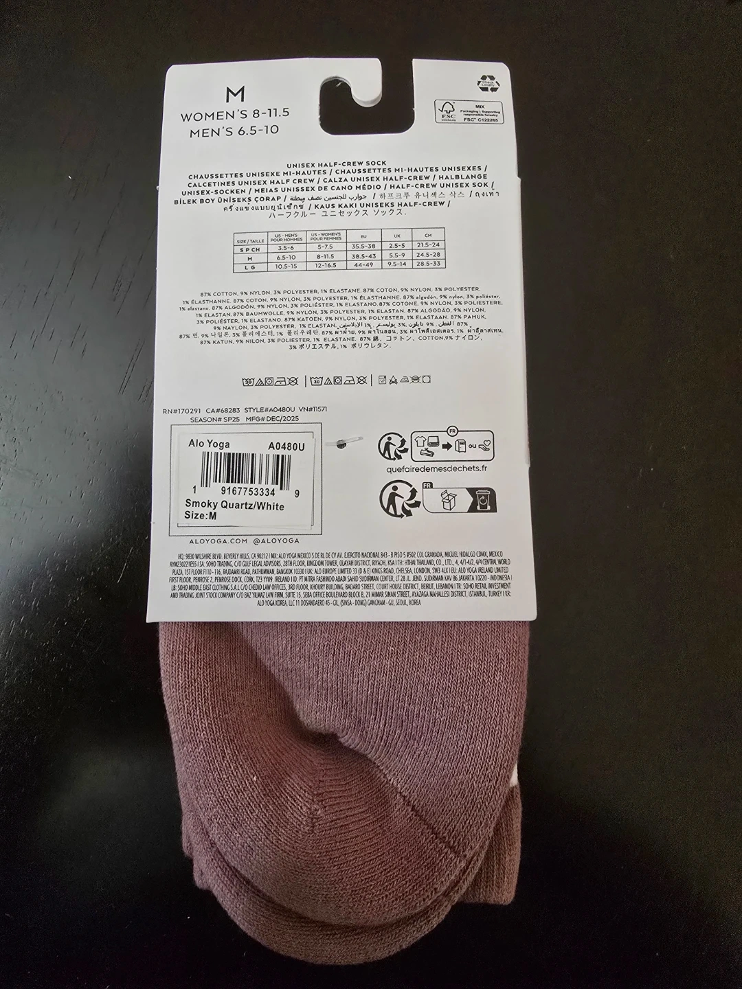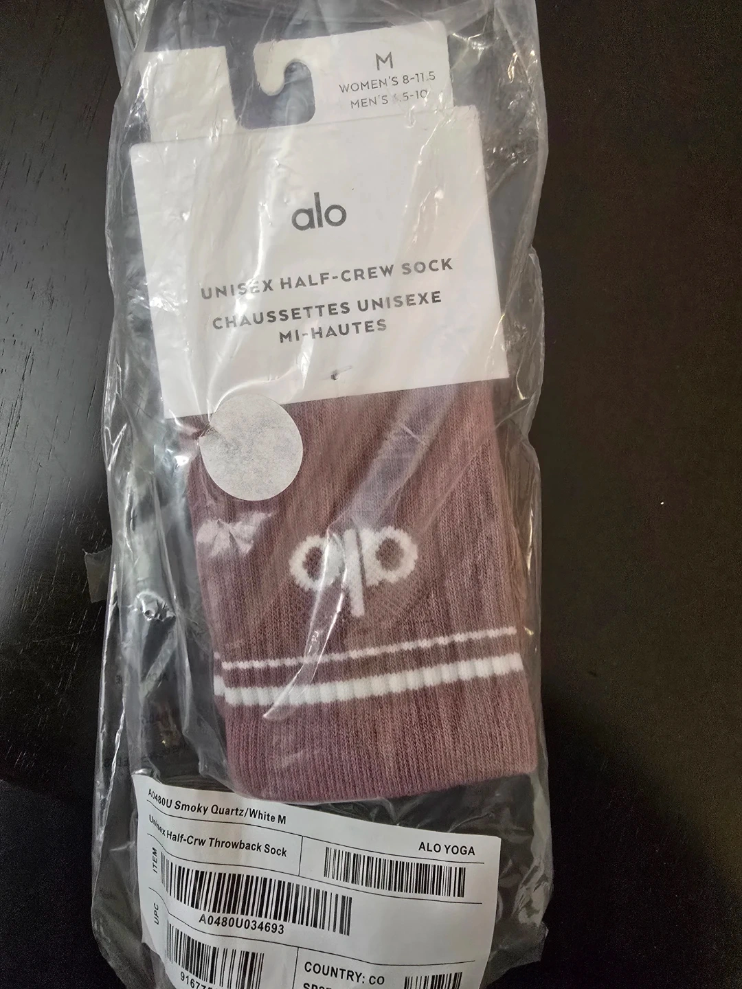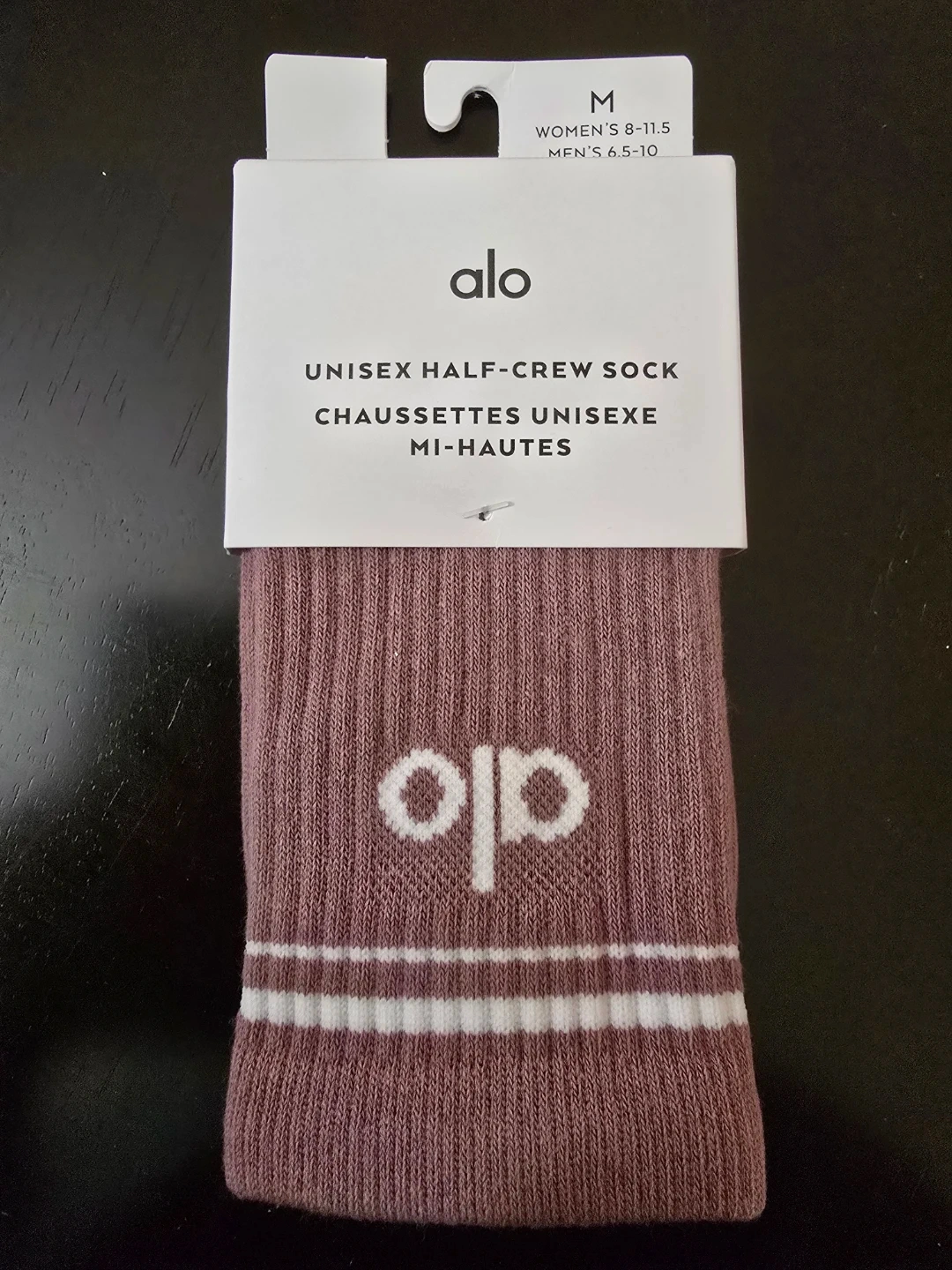 Alo Yoga unisex half-crew socks. Size M. Smoky Quartz/White color. Cotton blend material. These socks are designed for comfort and style.