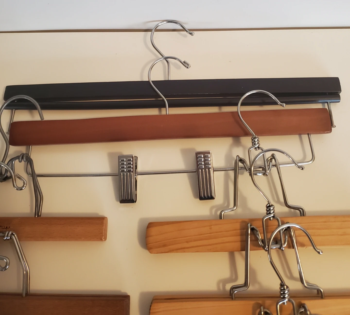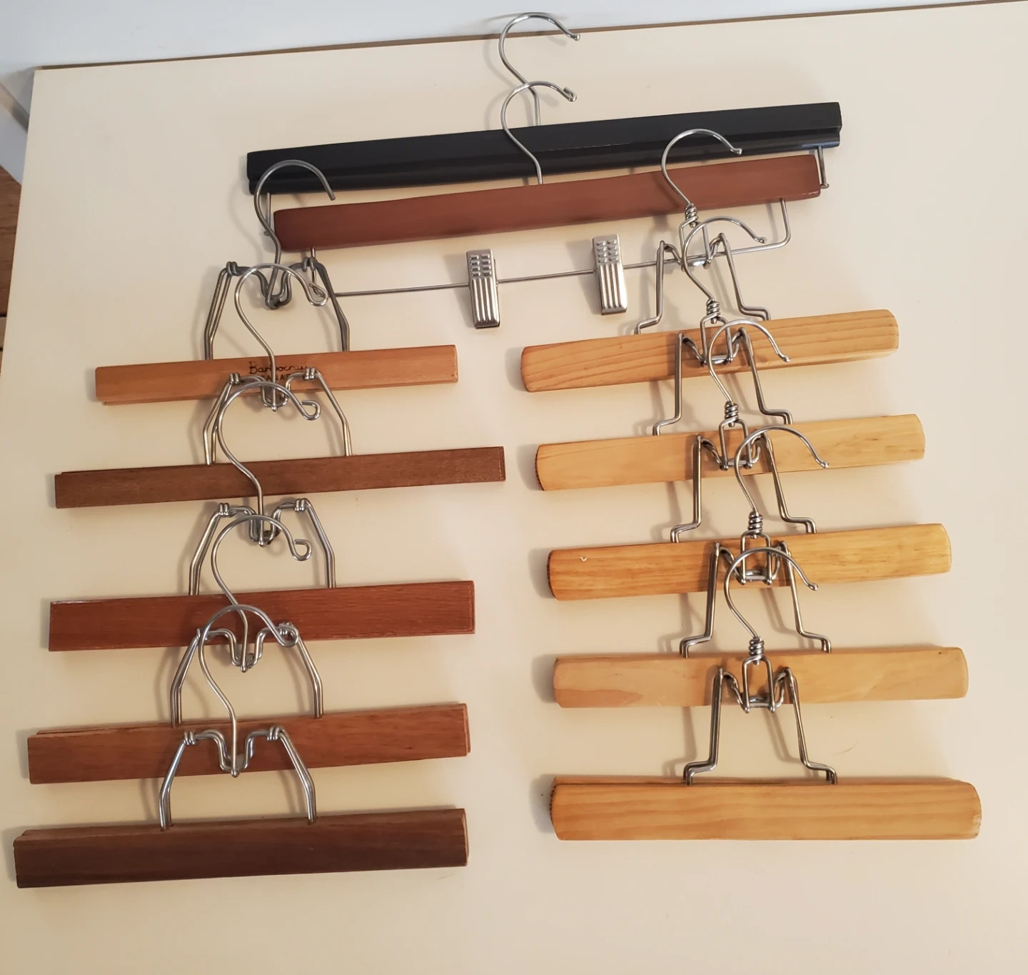12 wooden hangers designed for pants and skirts. They feature a smooth wood finish and sturdy metal clips. Fully functional.
