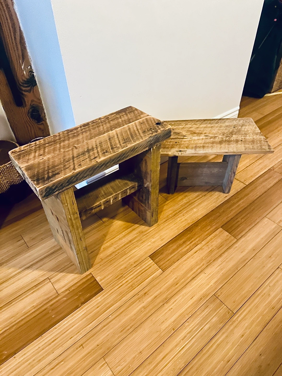 Misc. vintage reclaimed barn beam coffee end side accent night tables. Beautiful grain character & honest markings on 100 yr. old Douglas Fir & mixed woods.