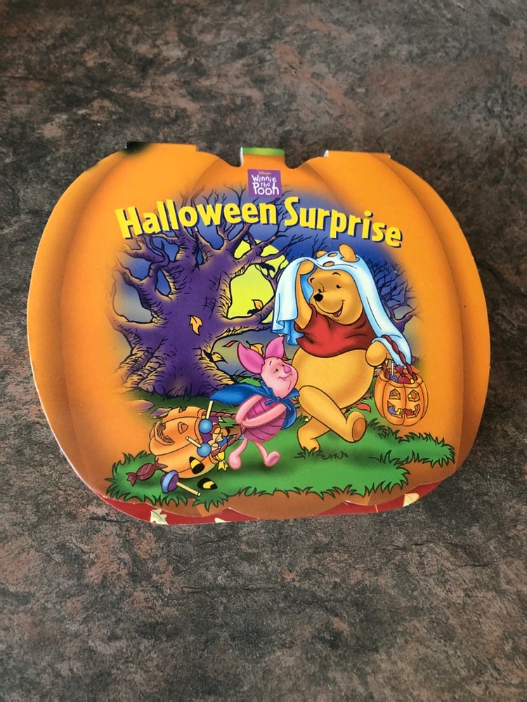 A Winnie the Pooh book shaped like a pumpkin. Surprise at end is missing, but there is a pocket to add your own.