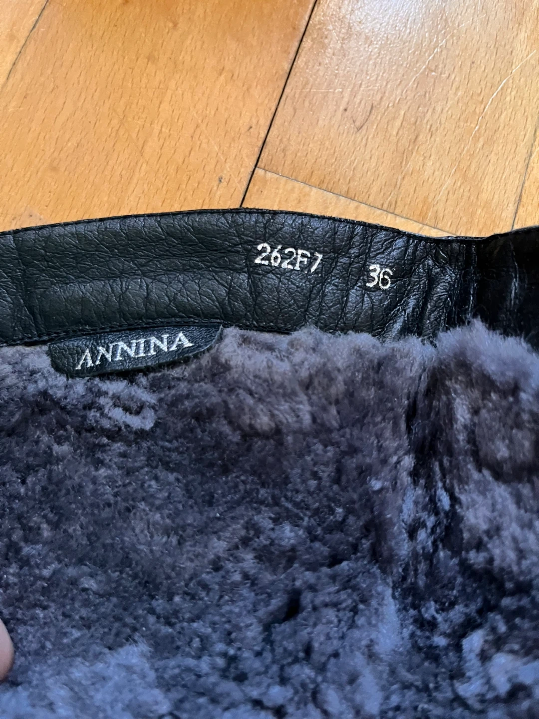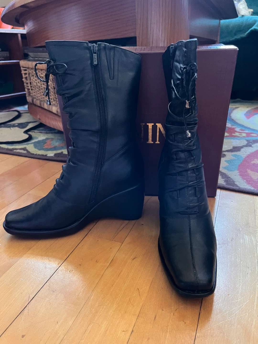 Winter Annina women's black leather wedge boots. Size 36. Genuine leather material with a cozy lining. These boots feature a side zipper and decorative lacing detail. Original price $250