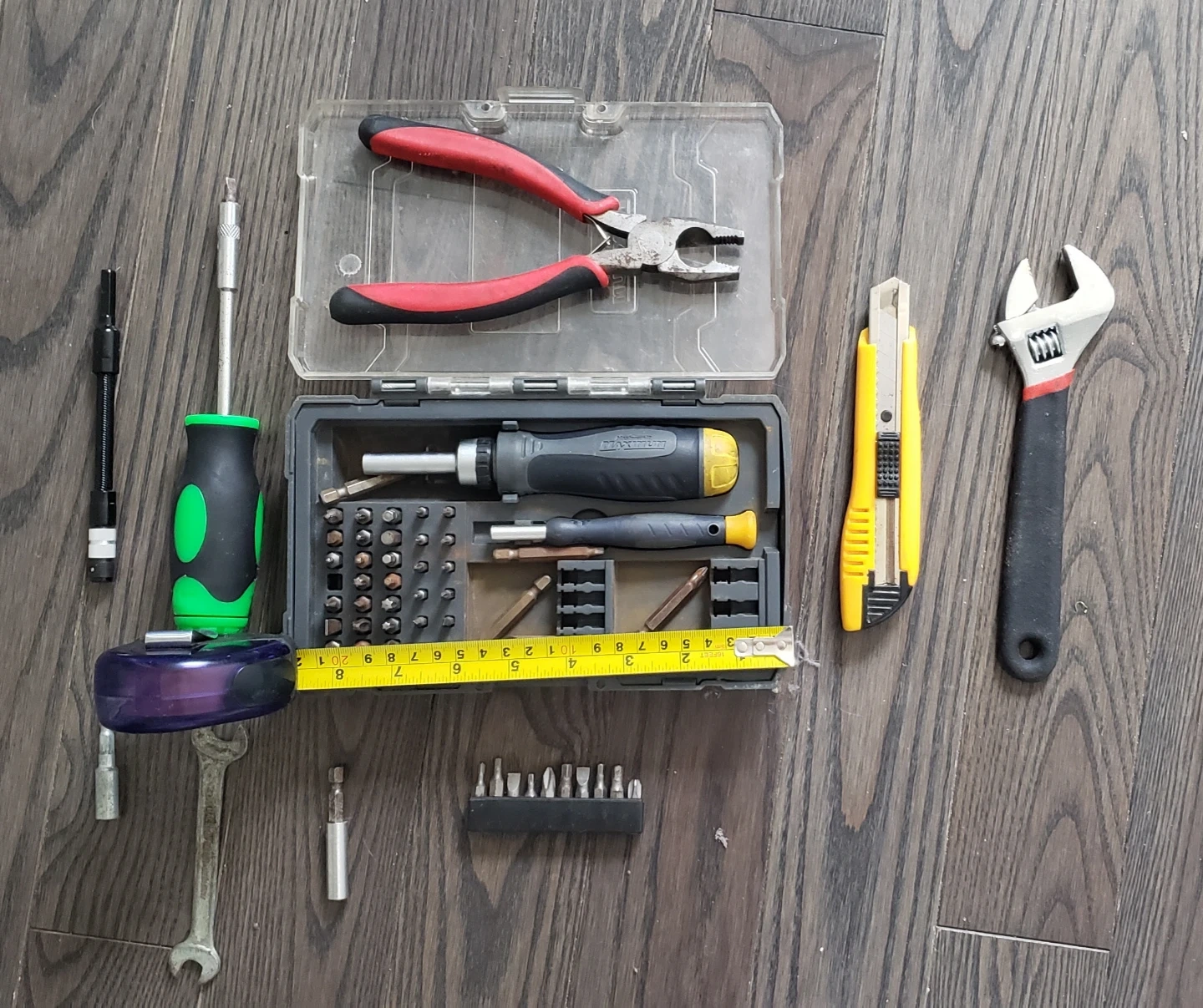 This is a collection of hand tools including a ratcheting screwdriver with various bits, a pair of pliers, a utility knife, an adjustable wrench, and a tape measure. All items are shown laid out on a wooden surface.