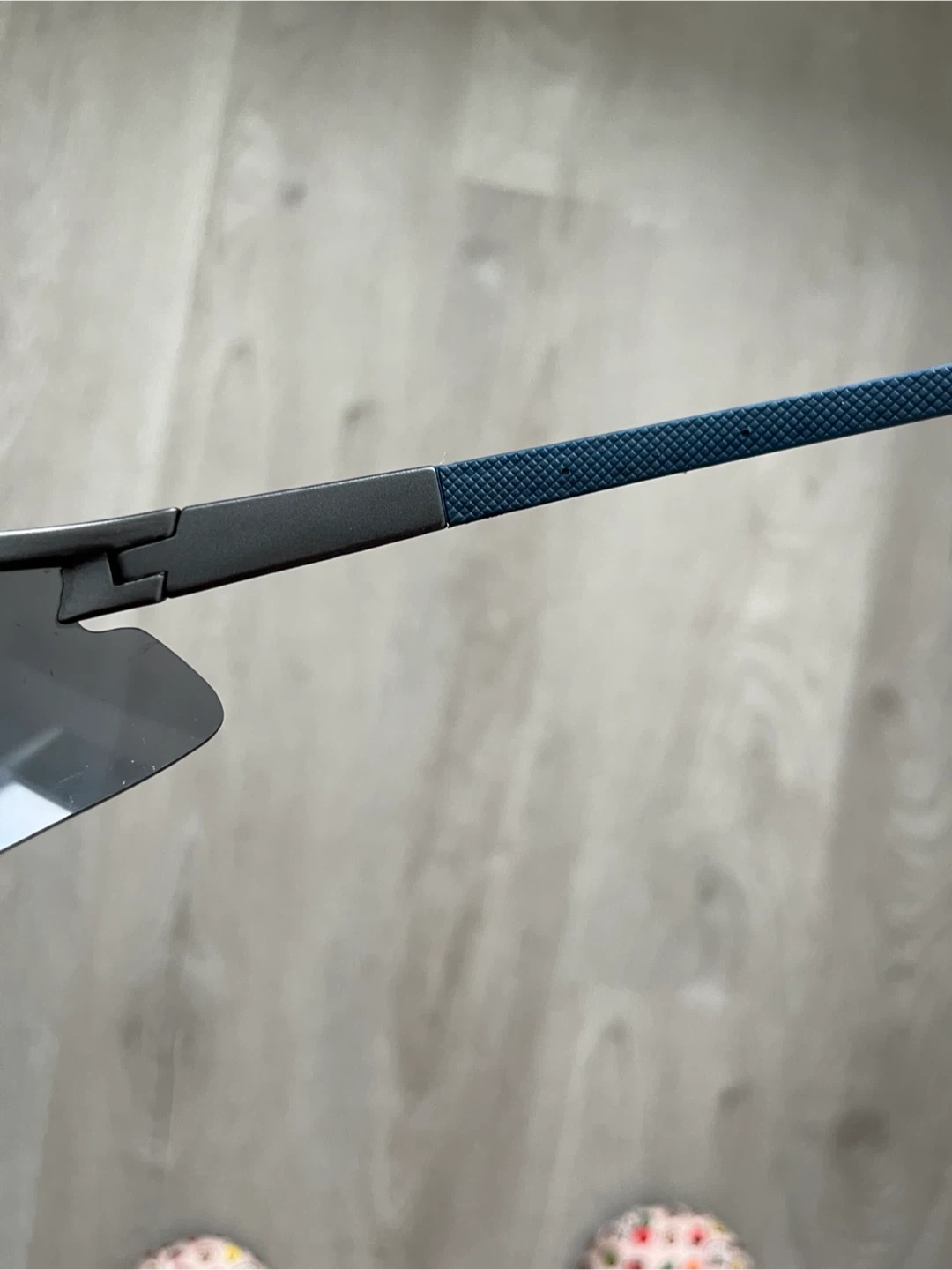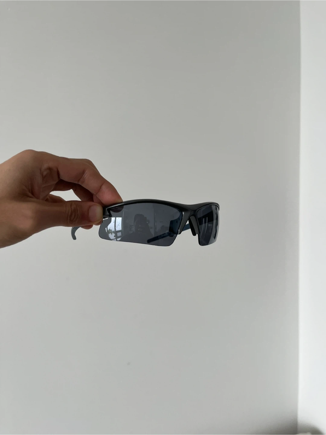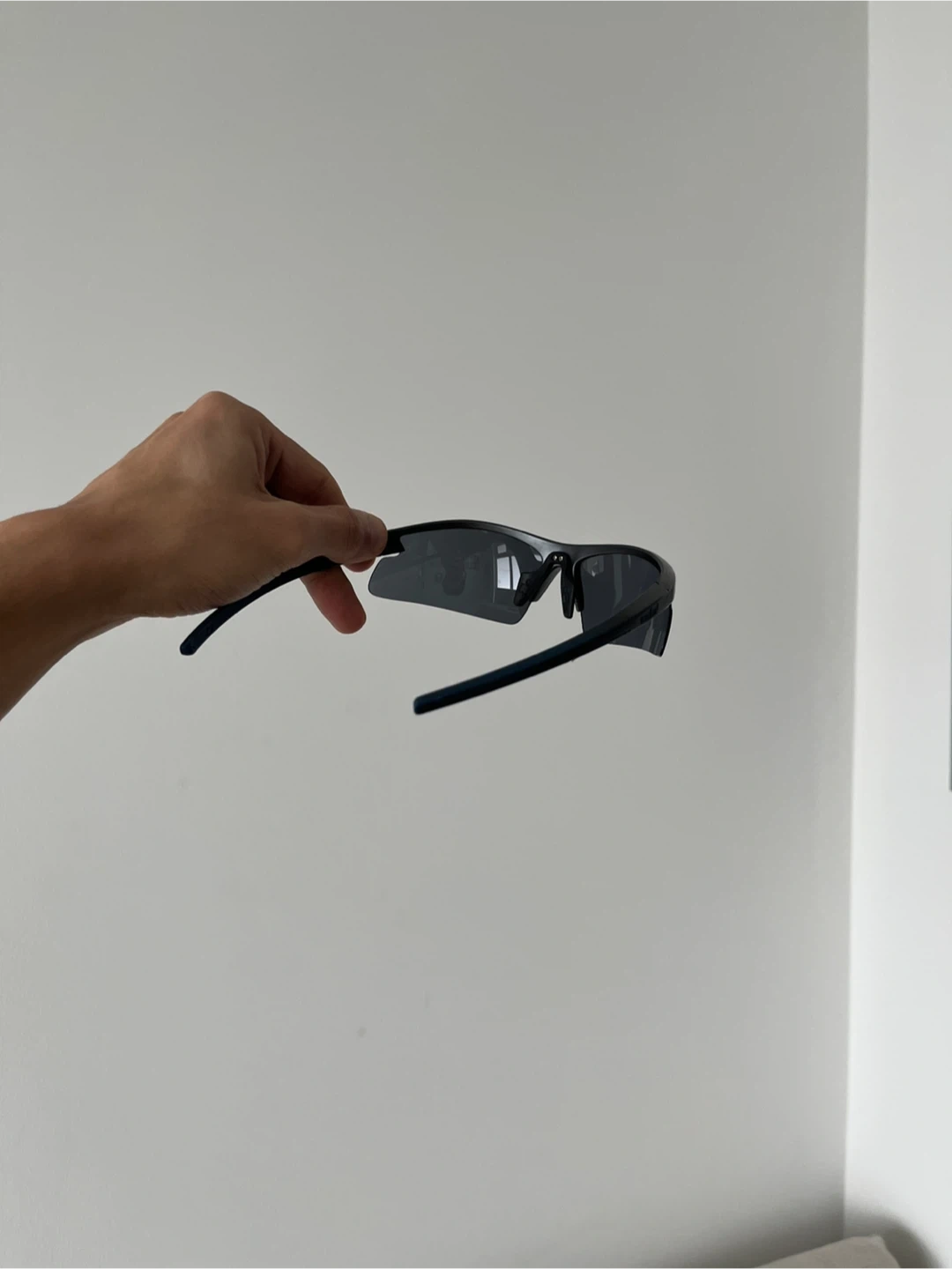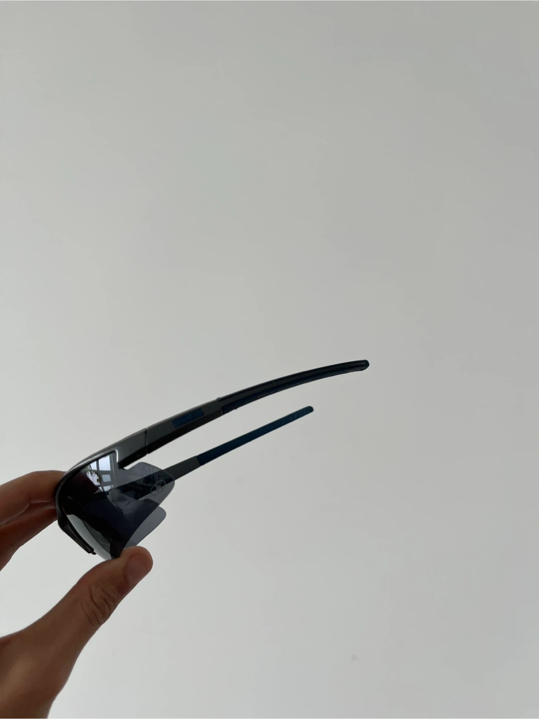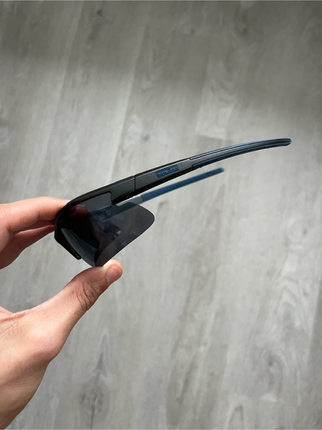 These are Oakley-style vintage sunglasses. They're grey blue with grey accents on the arms. They're a sporty style and perfect for running, festivals, or a fashionable piece.