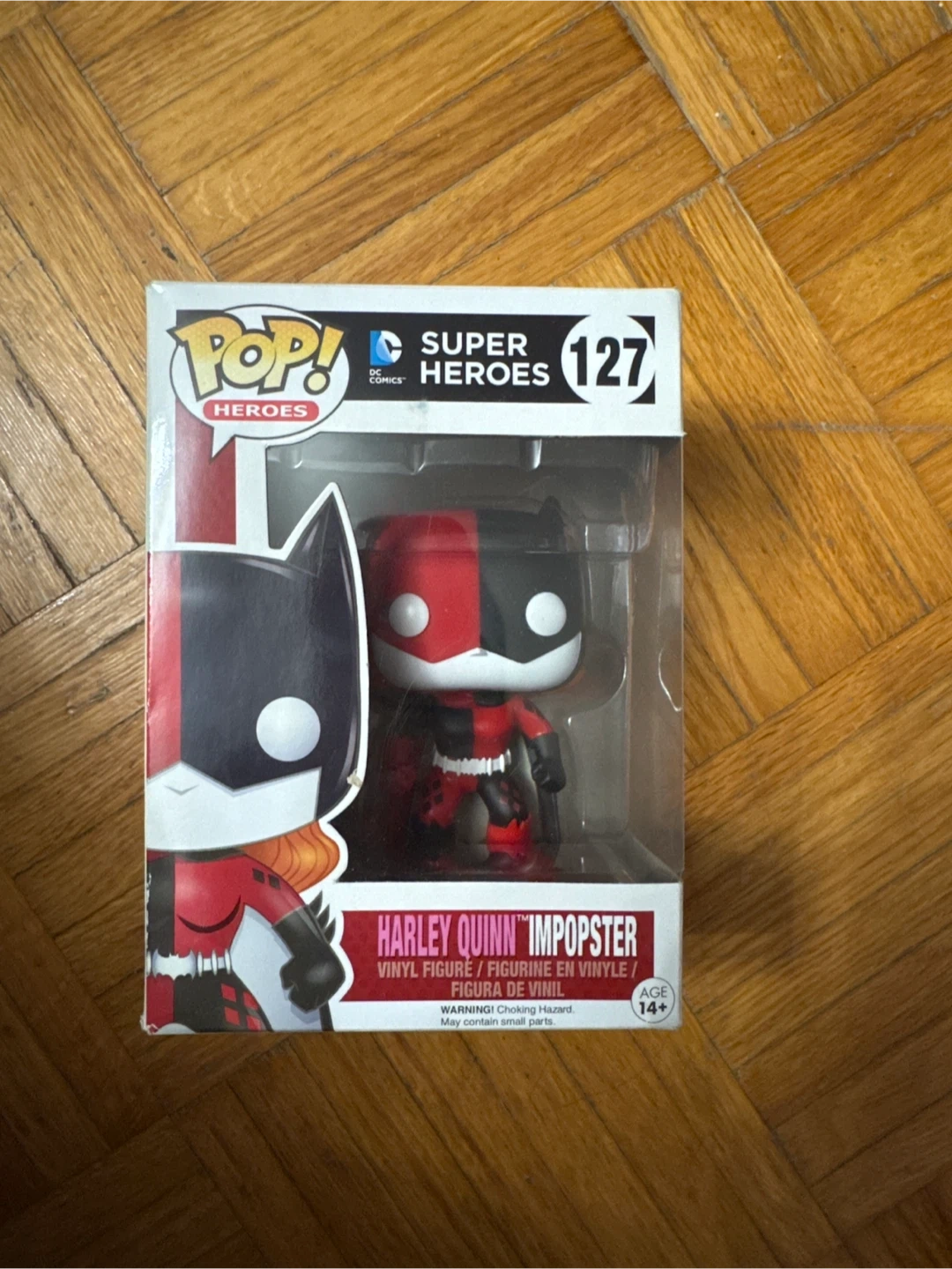 This is a Funko Pop! vinyl figure of Harley Quinn as an Impopster. It's from the DC Super Heroes collection and is number 127. Recommended for ages 14+.