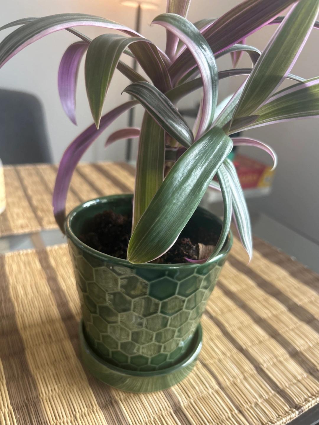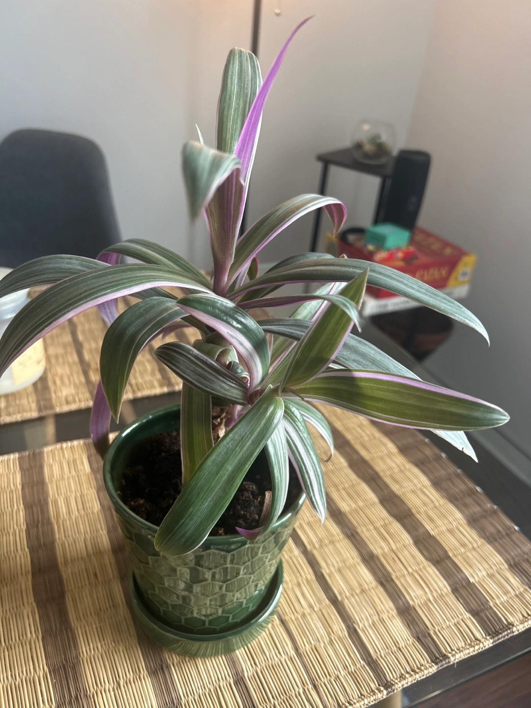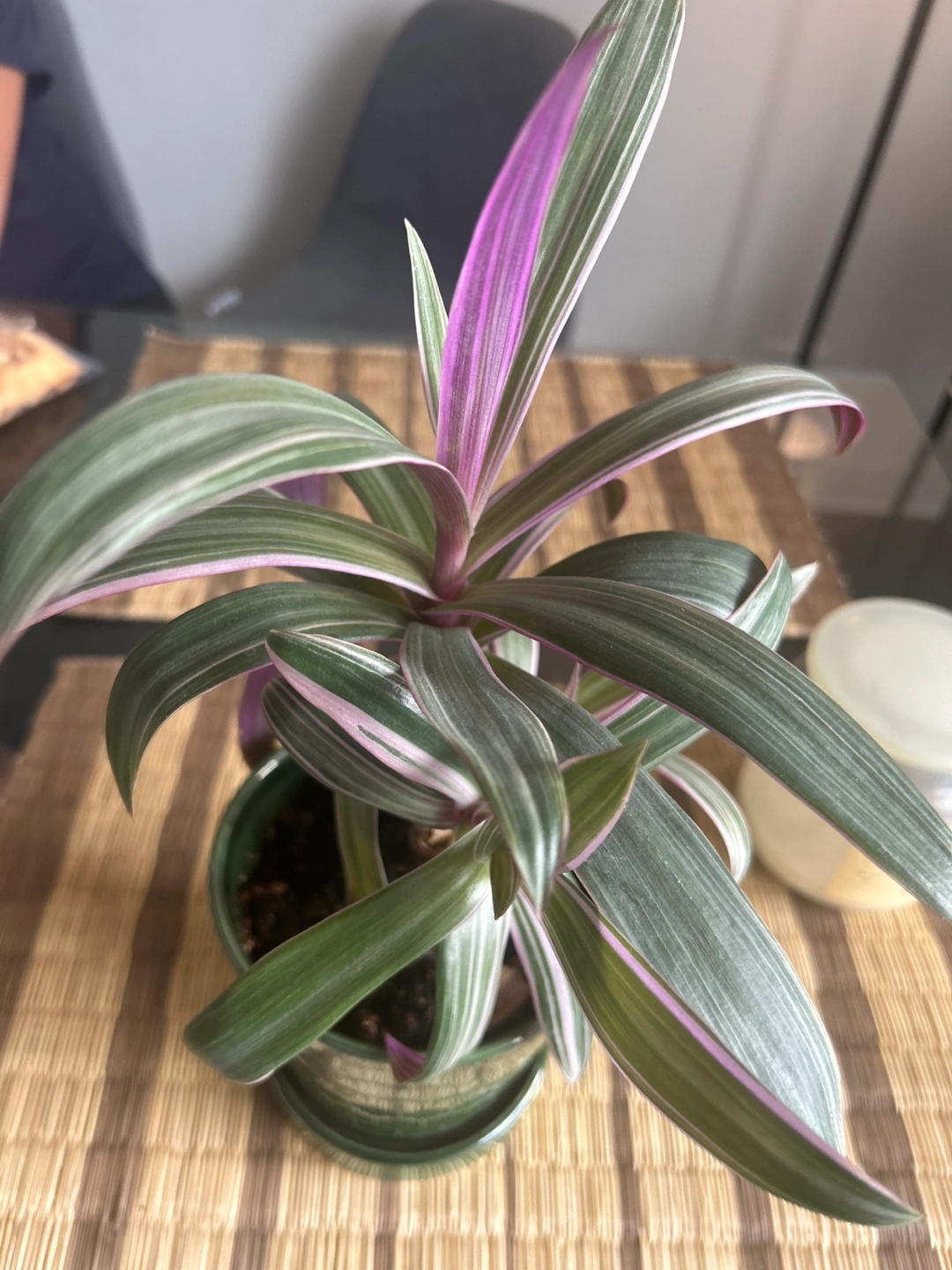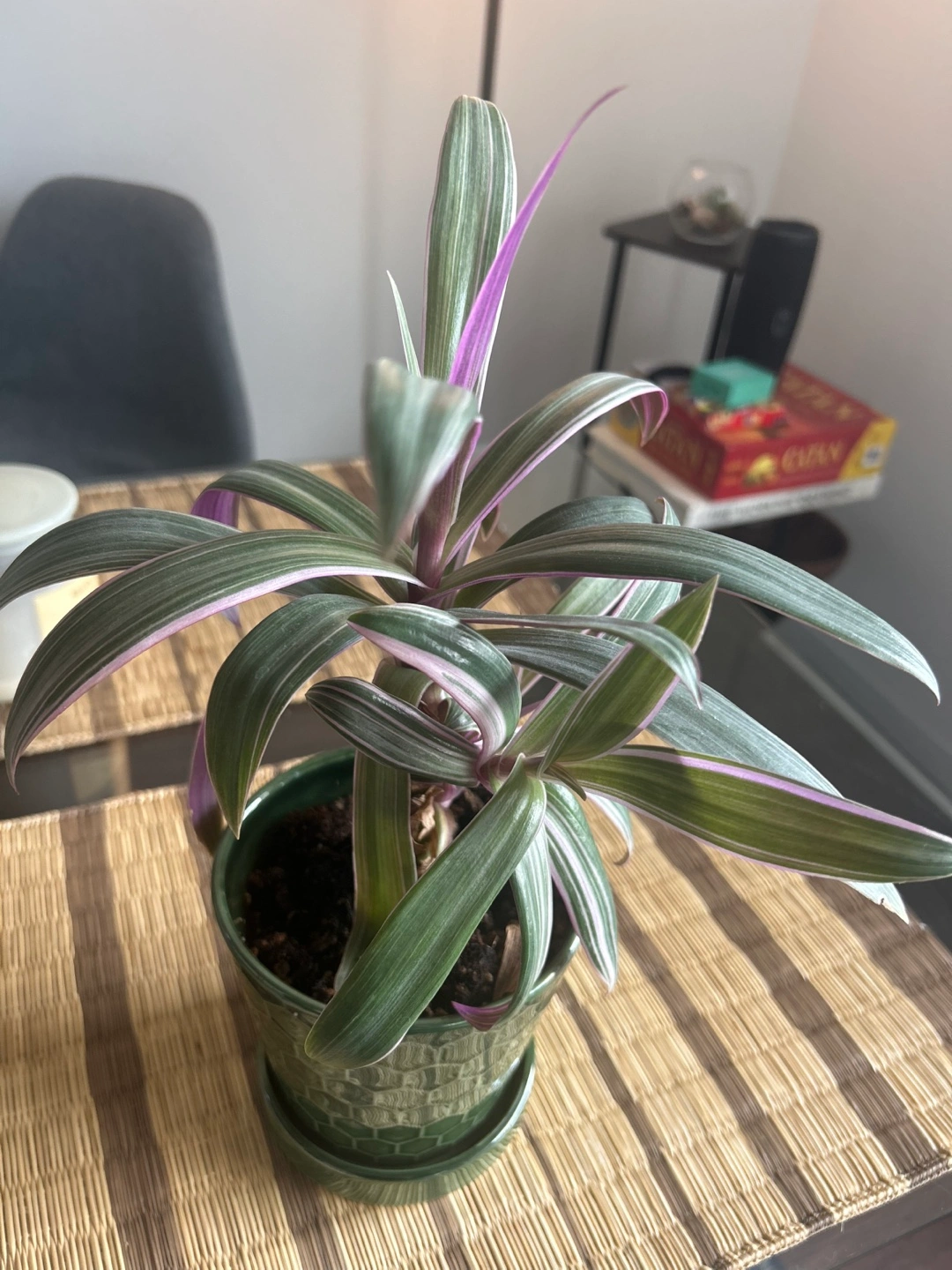 Healthy Tradescantia Nanouk in a green pot. Long, slender leaves with purple and silver stripes. Small to medium size. Great addition to any home. Has three new plants shooting out which can be grown into 3 full size plants.