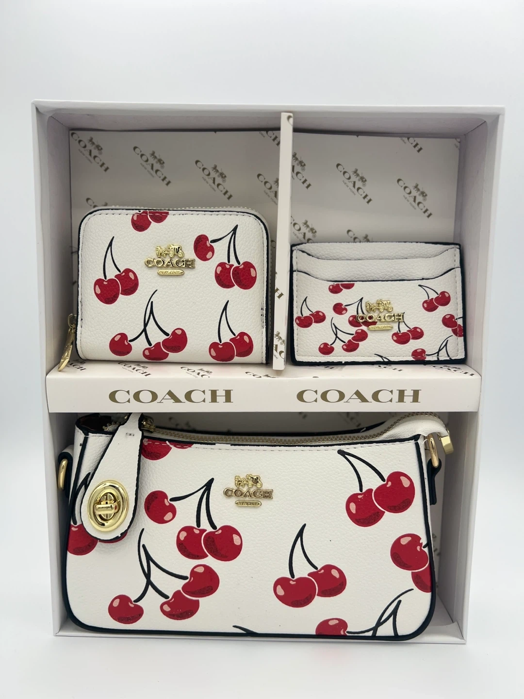 This Coach set includes a zip-around coin purse, a cardholder, and a small Shoulder purse. Each piece features the signature Coach "C" monogram pattern or a decorative cherry print. Gold-tone hardware accents each item.
