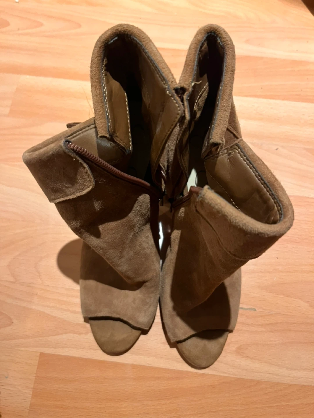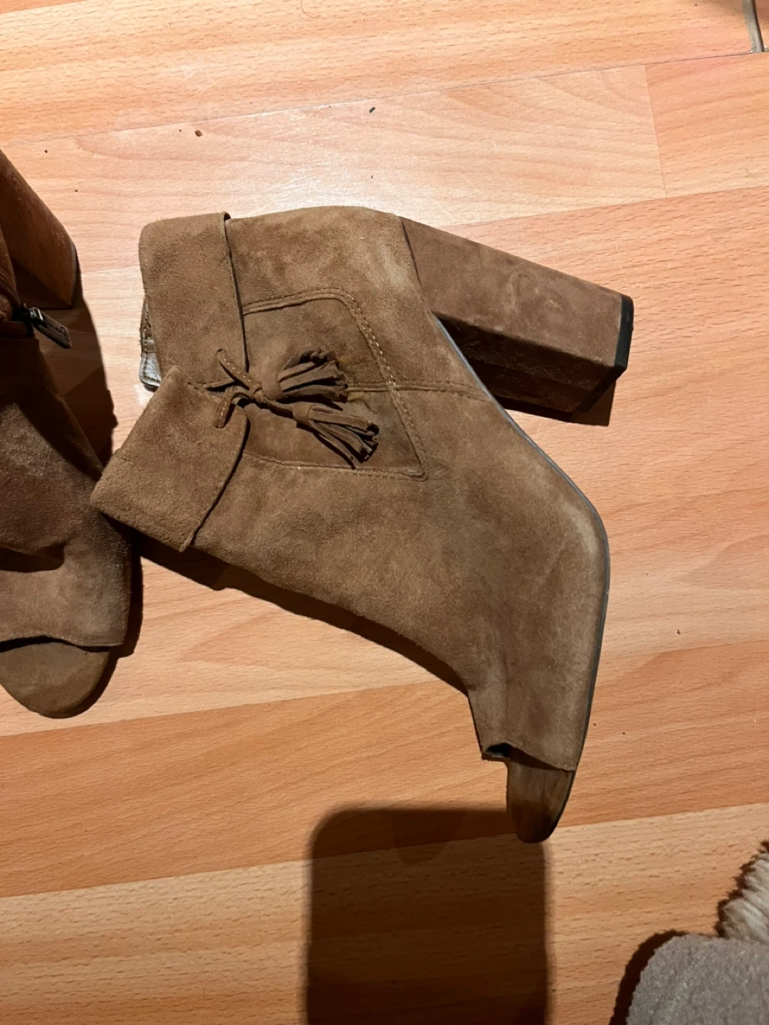 Jessica Simpson brown suede ankle boots with tassel detail. Peep-toe design and block heel. Side zipper closure. Size 7.5.