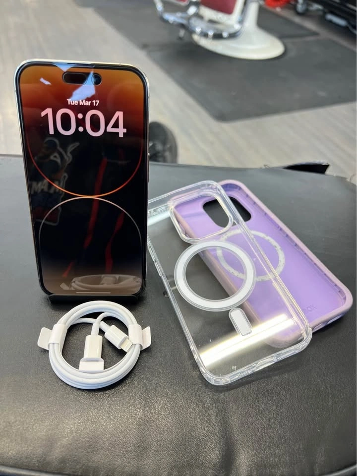 Selling my 512 GB iPhone 14 Pro with 100% battery health. It's fully unlocked and works with any carrier. Includes a clear MagSafe case, a purple case (looks like OtterBox), and a charging cable. Everything is in great condition. The back has a small crack from being dropped, but it doesn't affect performance at all.