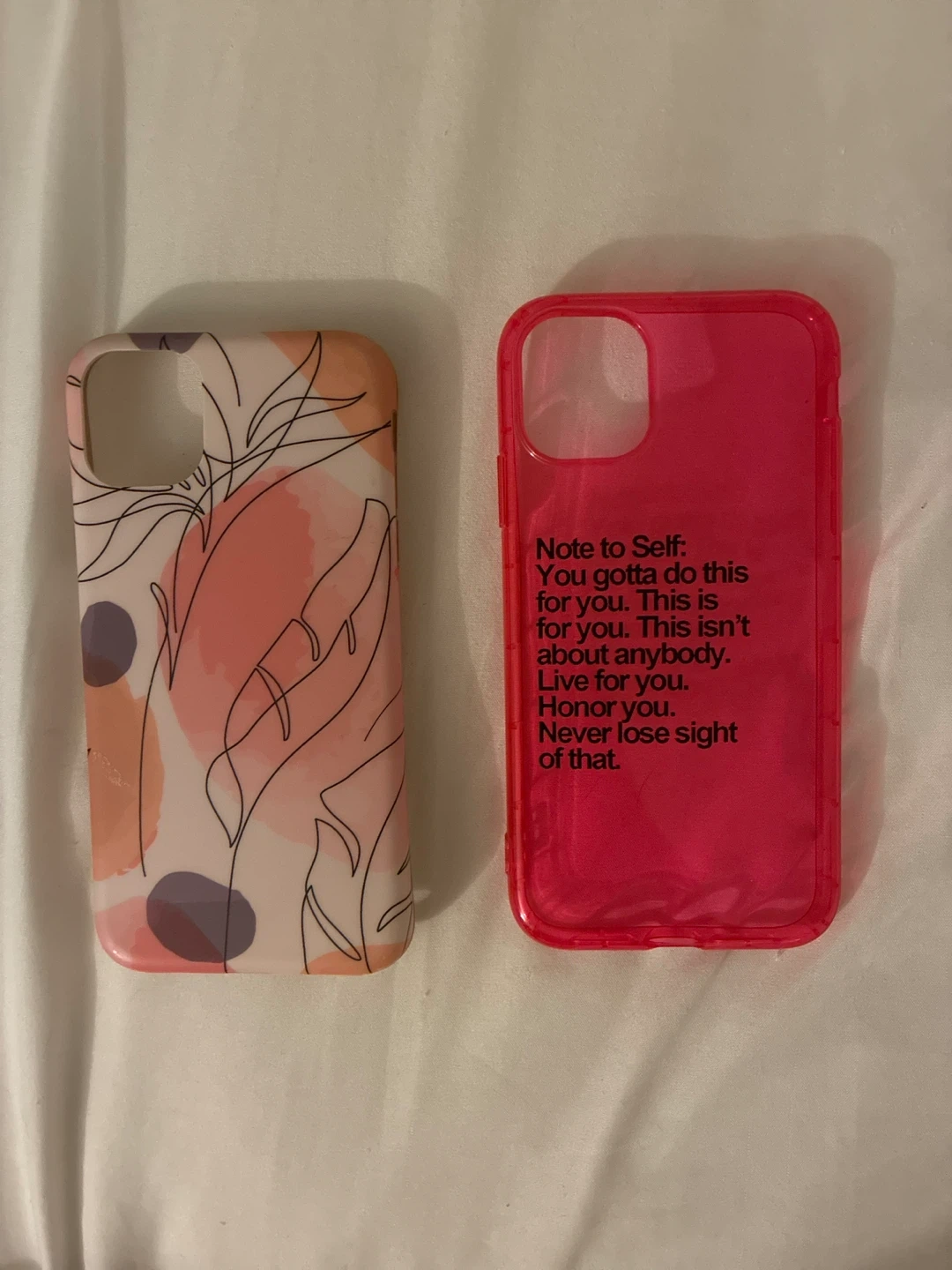 This listing includes two phone cases. One case features a pink, orange, and purple abstract floral design. The other case is transparent pink with a motivational quote.