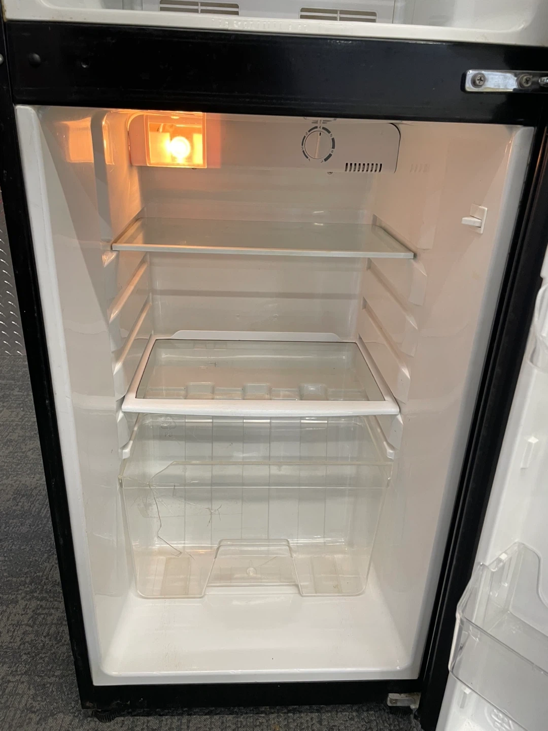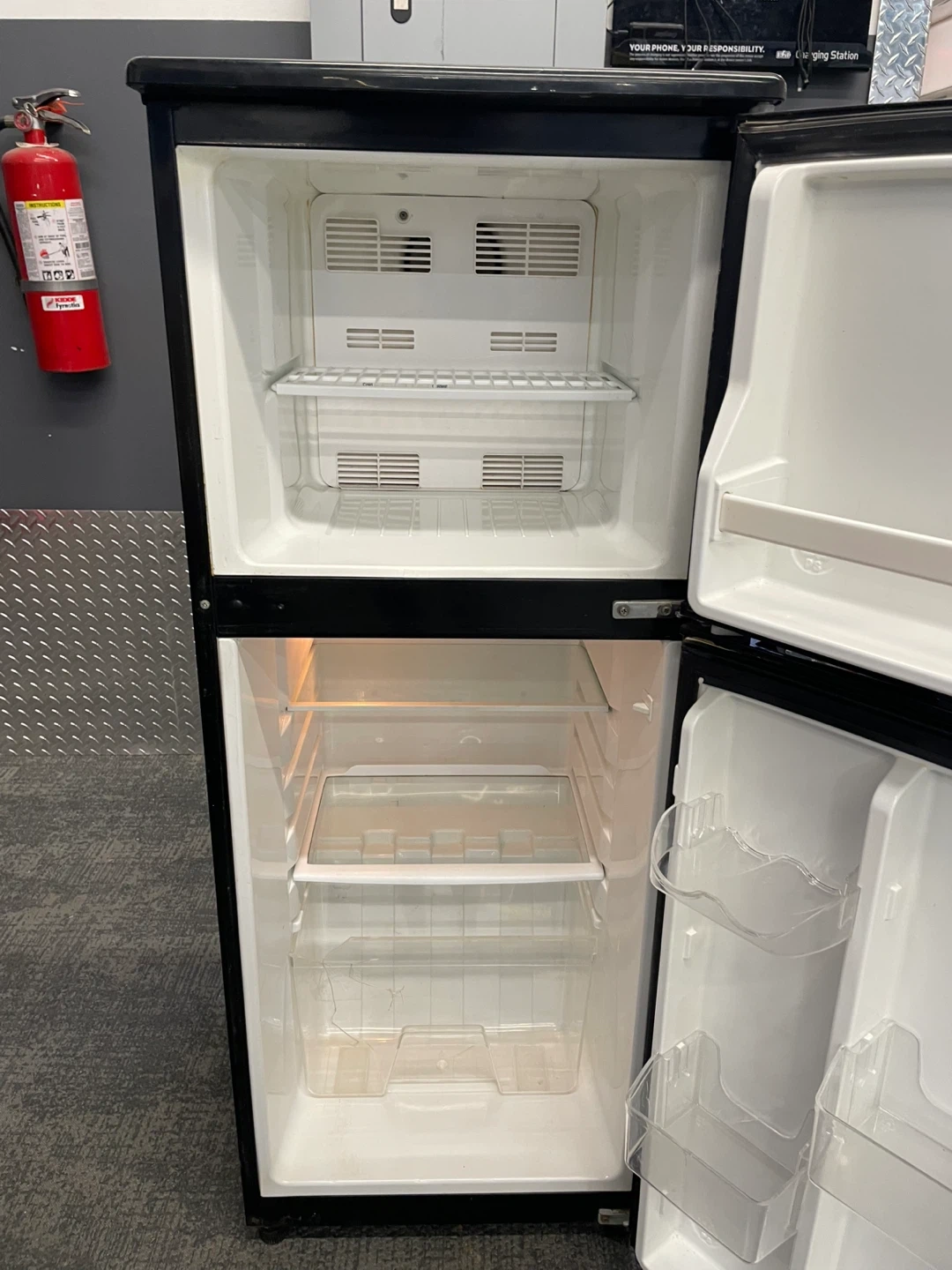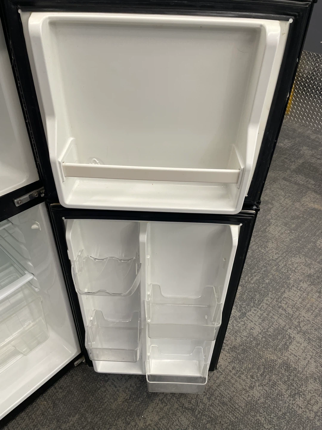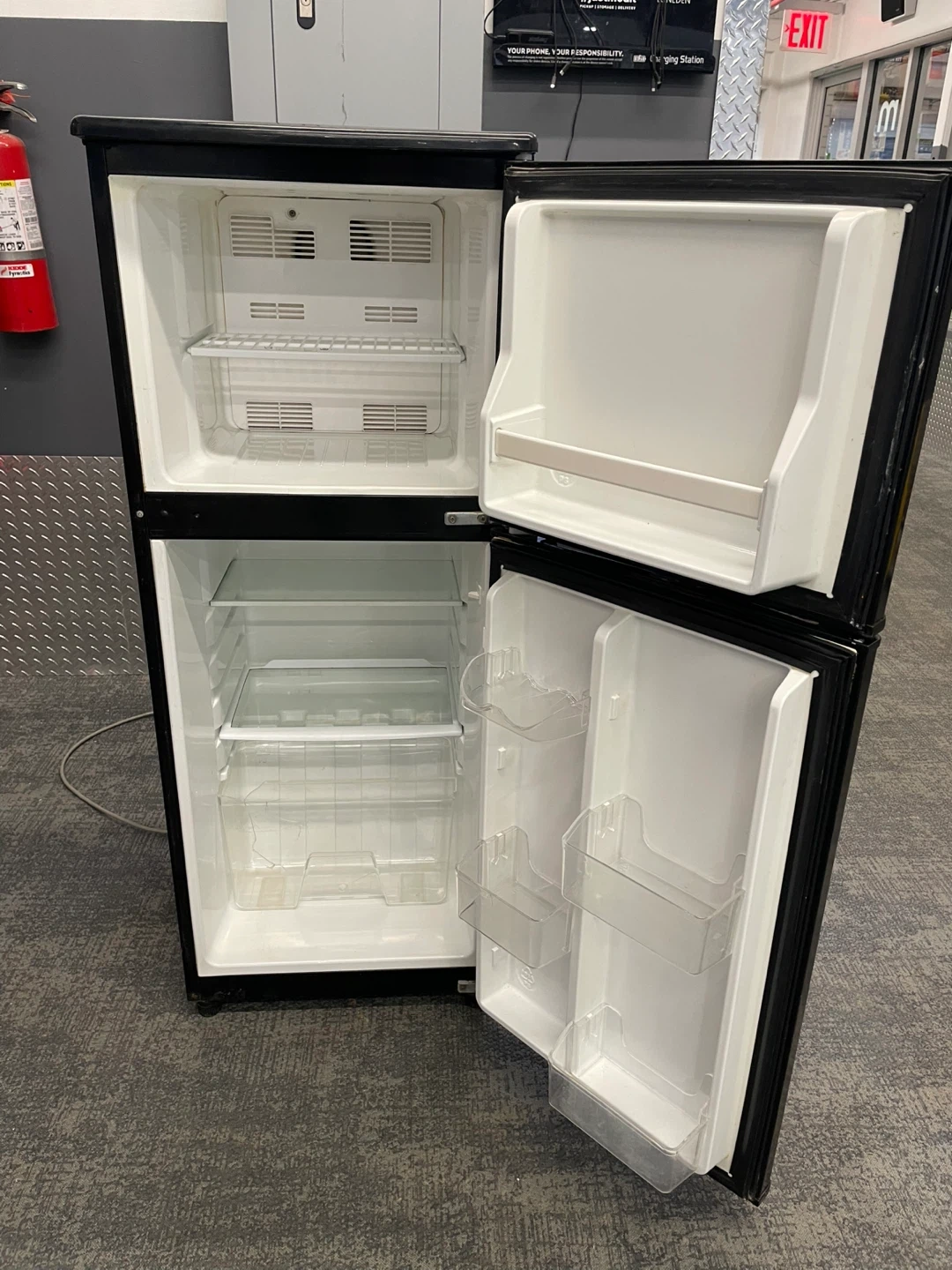 Selling a Frigidaire mini fridge in black. It's a compact fridge, perfect for a dorm room, office, or small apartment. It has shelves and door storage for organization.