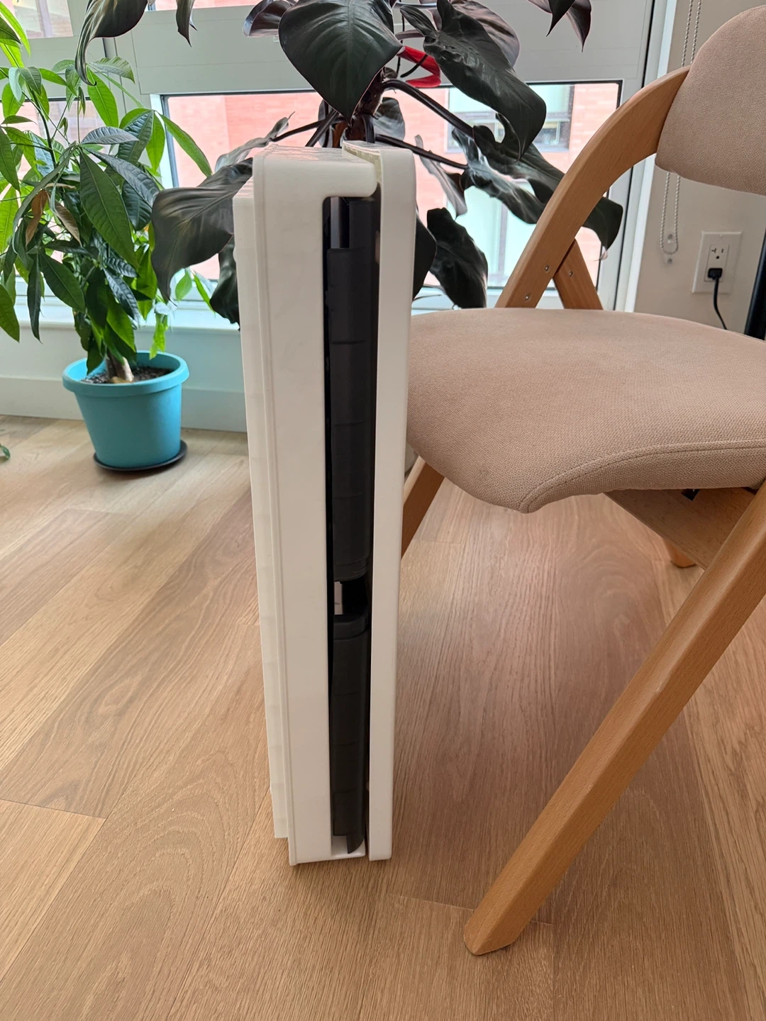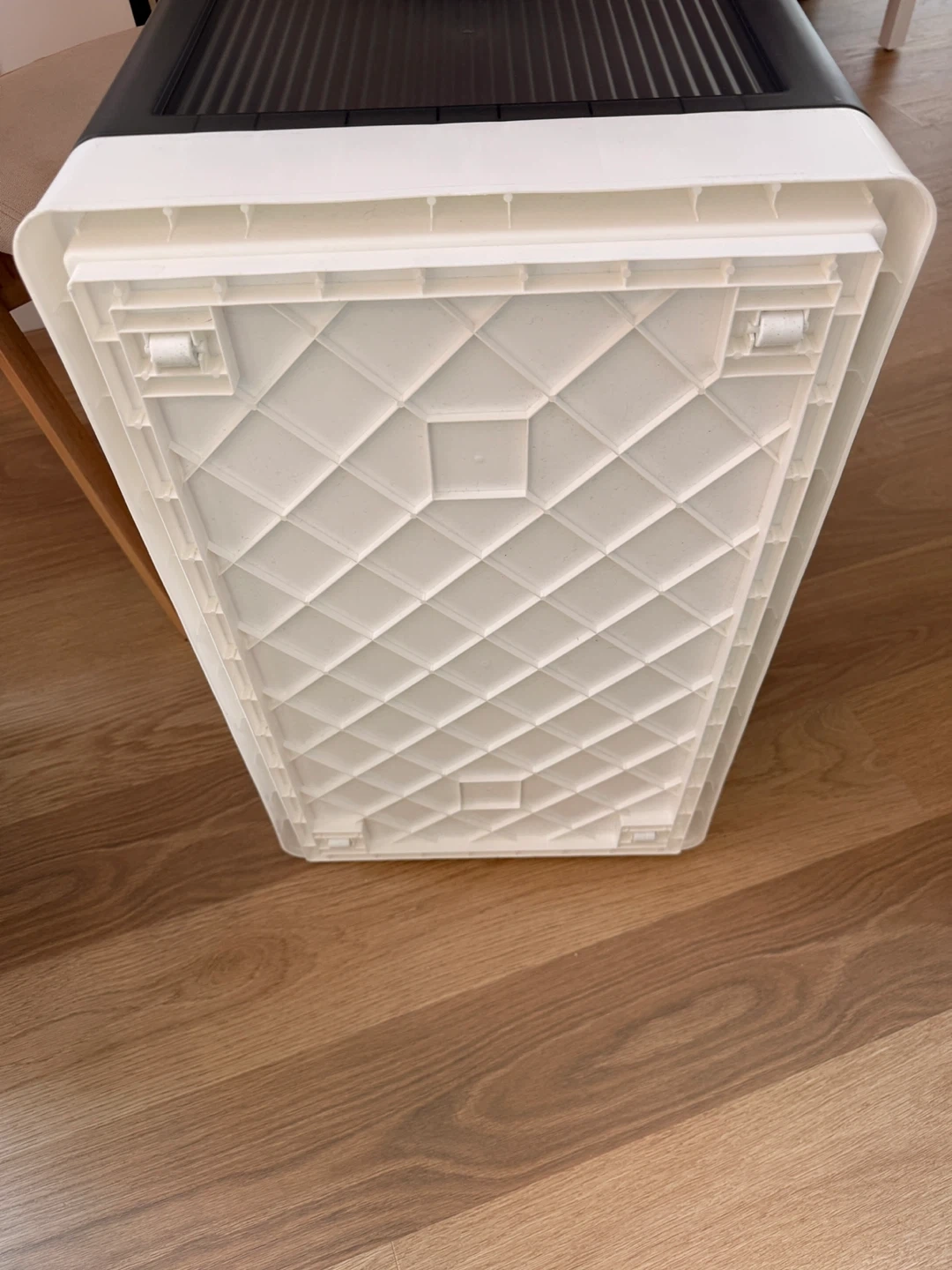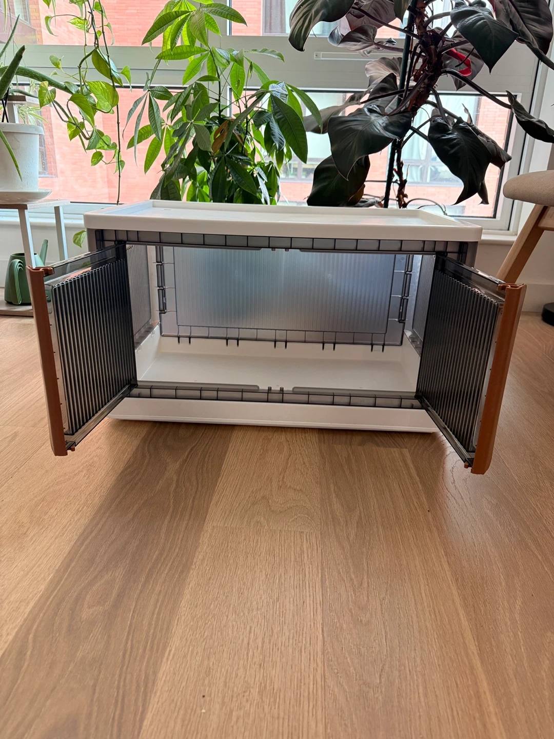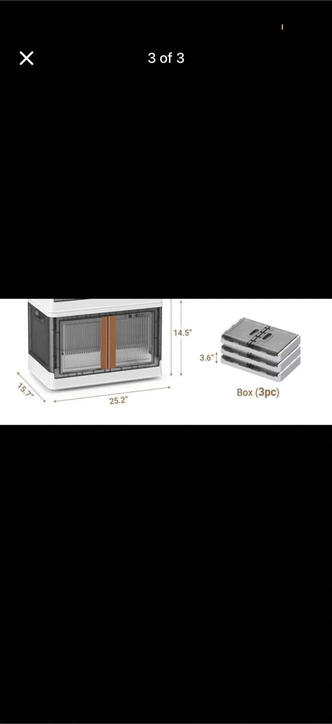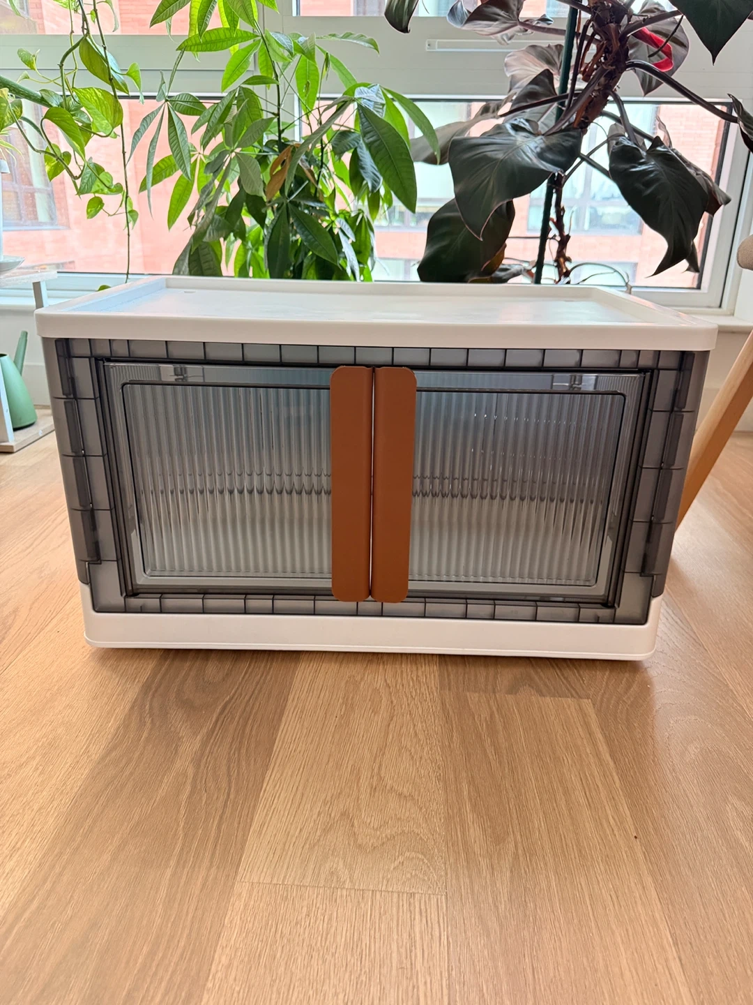 This is a white and clear folding storage box. It's made of plastic and has a capacity of 25.2 inches long, 15.7 inches deep, and 14.5 inches tall when assembled. It folds flat for easy storage. This box is great for organizing spaces in your home!