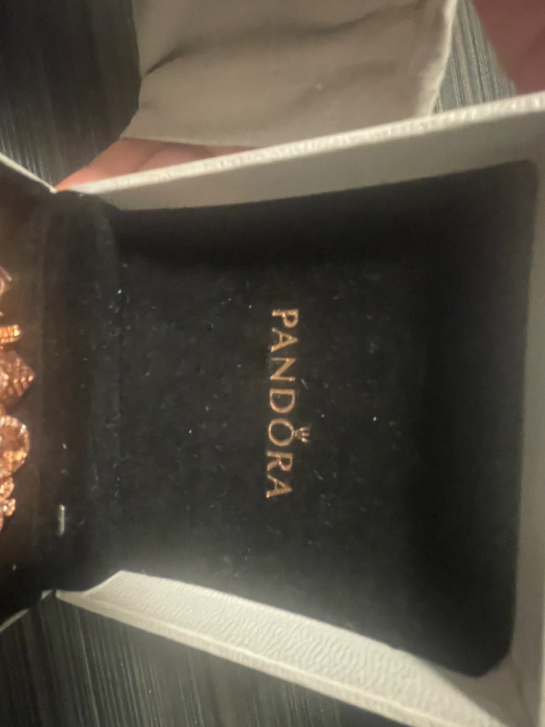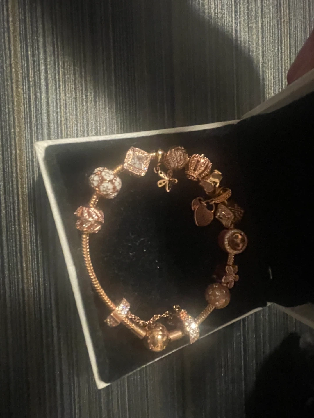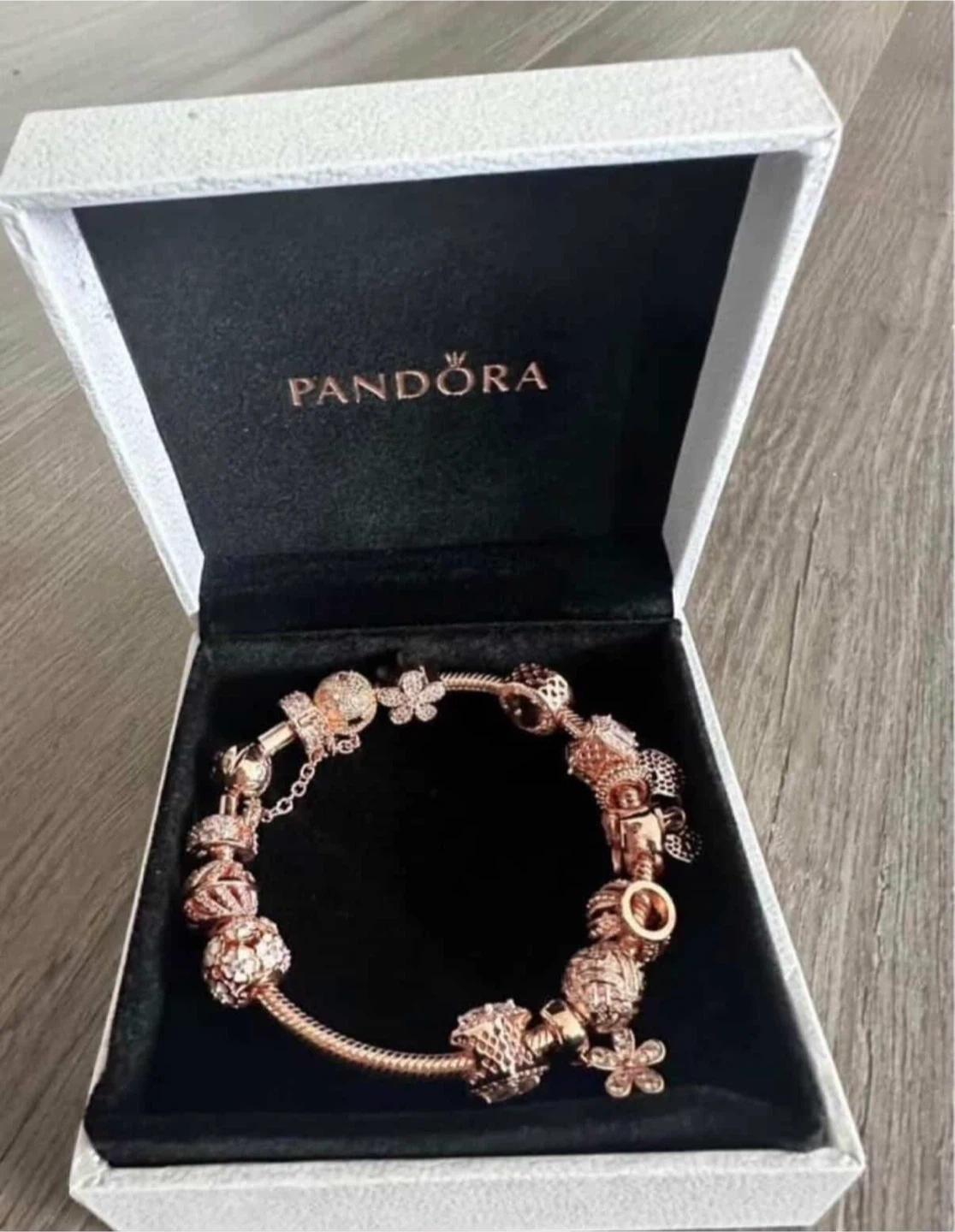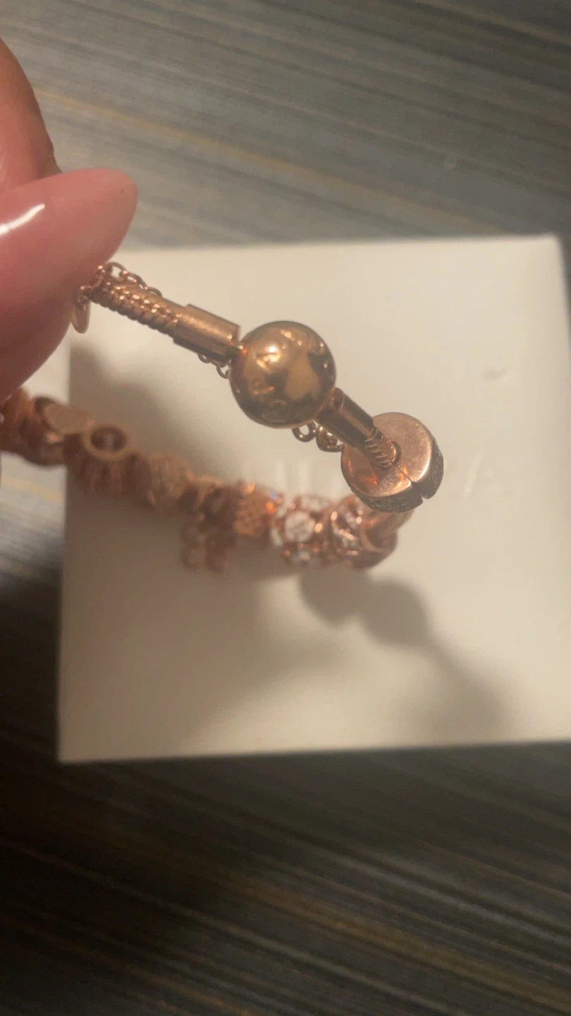 This Pandora bracelet is crafted from rose gold-tone metal and comes with a collection of charms. It's presented in its original Pandora box, ready for gifting or keeping!
