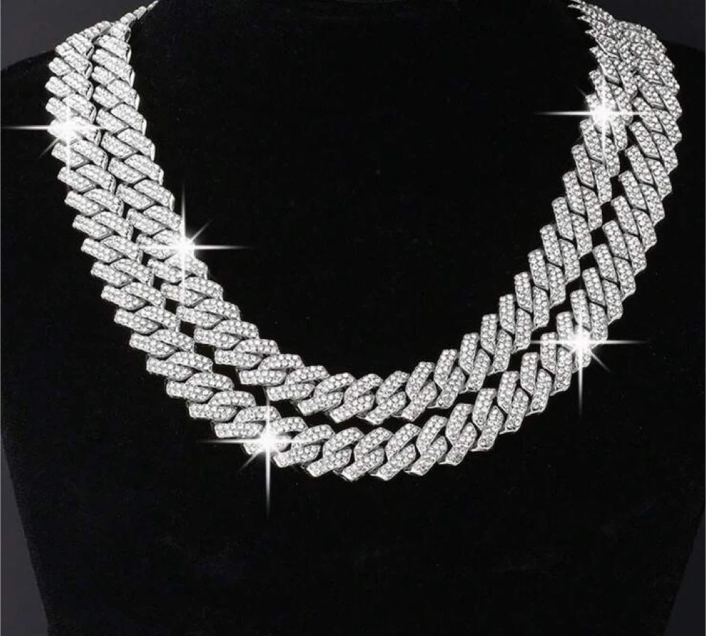 This necklace features a bold Cuban link design fully covered in sparkling simulated diamonds. It's a statement piece that's sure to turn heads. The chain is designed for durability and a comfortable fit.