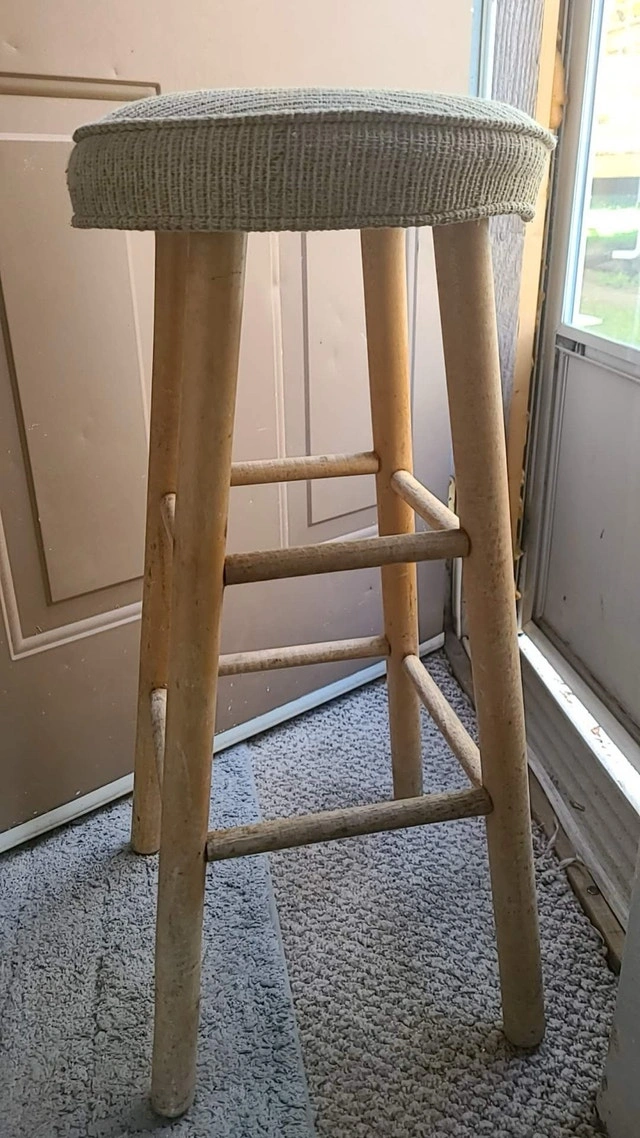 This is a wooden bar stool with a cushioned top, perfect for adding extra seating to your kitchen or bar area. As you can see in the images, the stool has some wear and tear, including a stain on the cushioned top. It still has a lot of life left. If the ad is still up, the bar stool is still available!