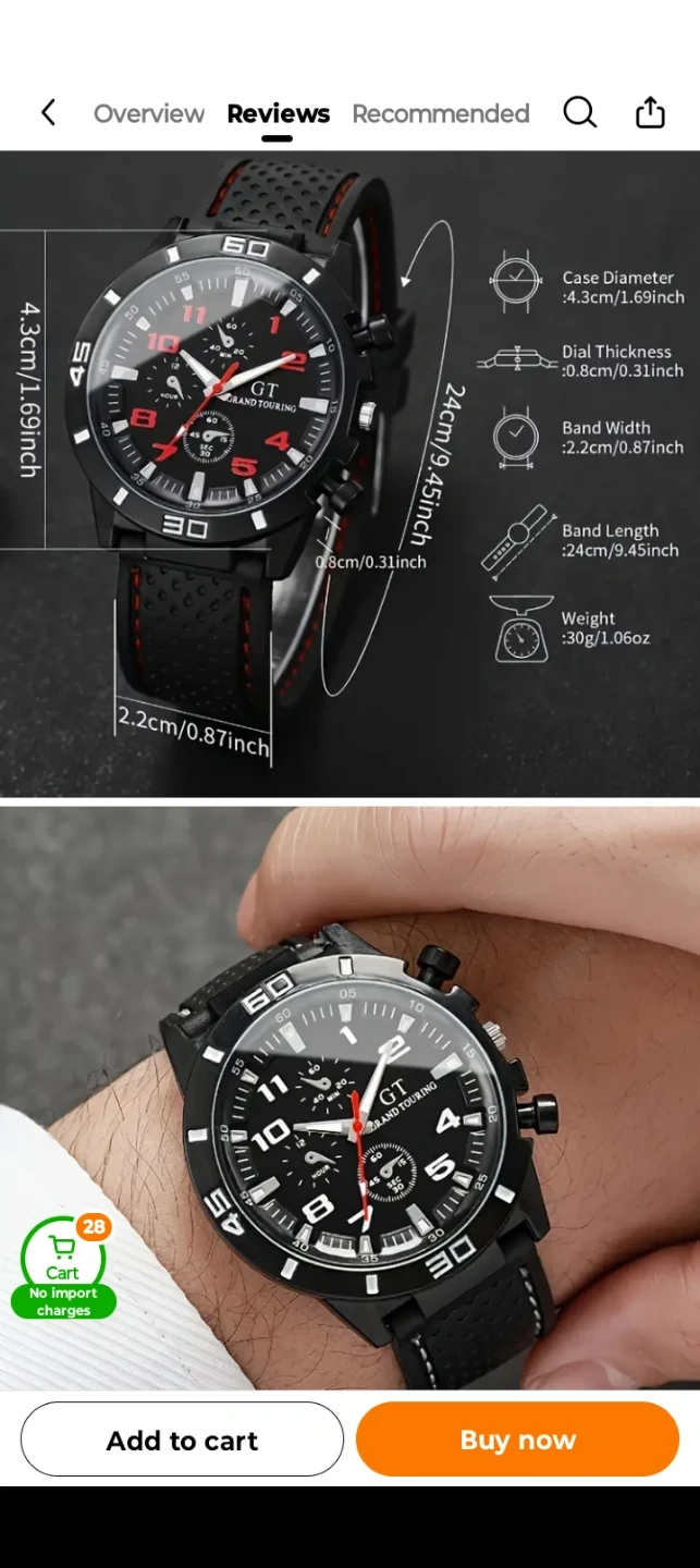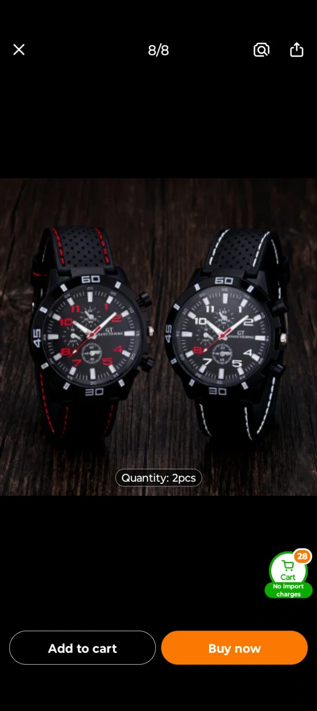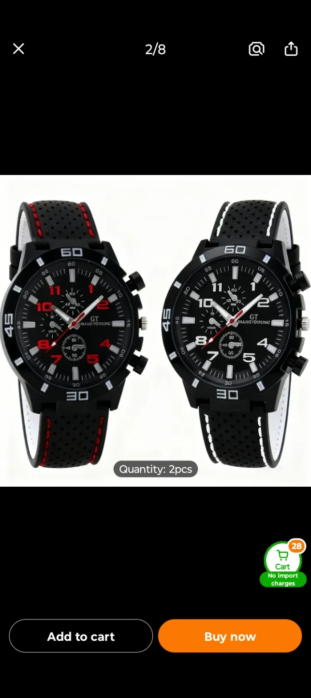 This is a 2-pack of GT Grand Touring men's watches. They feature black silicone bands with red or white stitching. Case diameter is 4.3cm. either red or white you choose 1 for $15 or 2 for $25