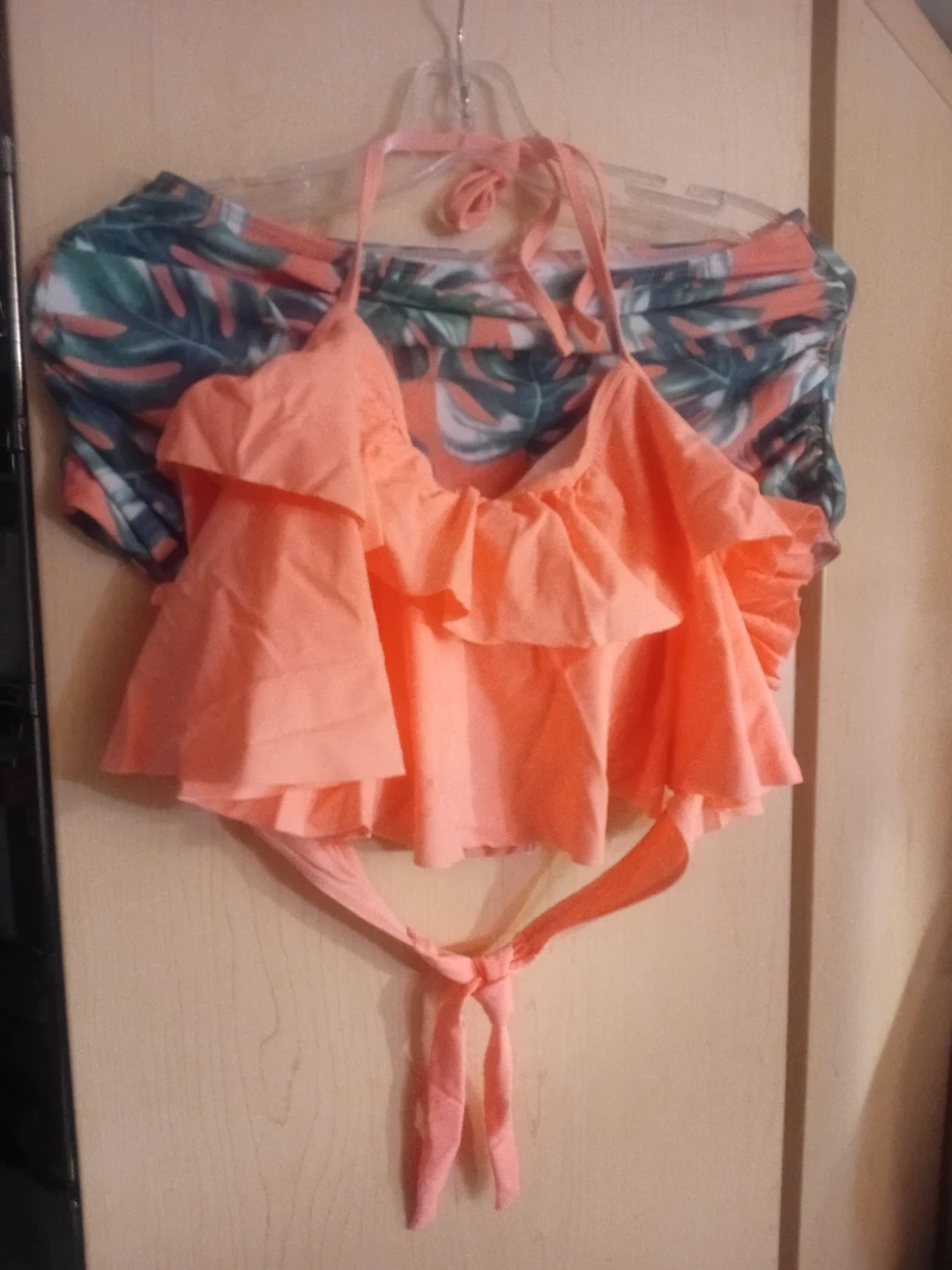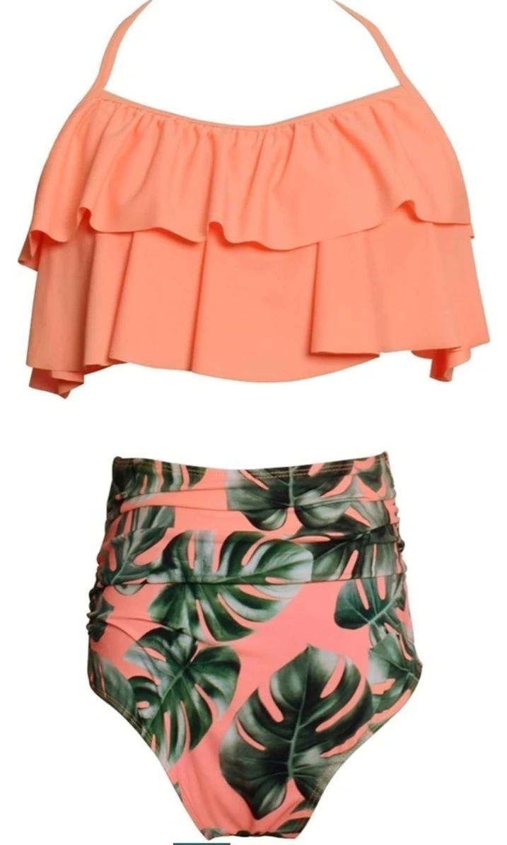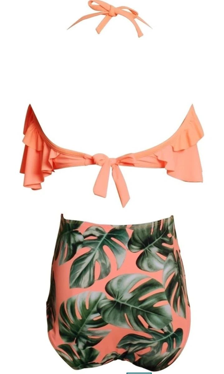 Two-piece swimsuit featuring a coral, ruffled off-the-shoulder top and high-waisted bottoms with a green leaf print. The top has adjustable straps for a secure fit. This style offers a flattering silhouette for beach or pool days.