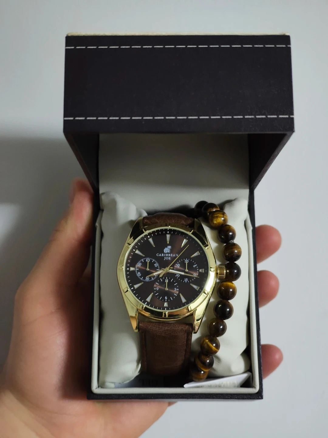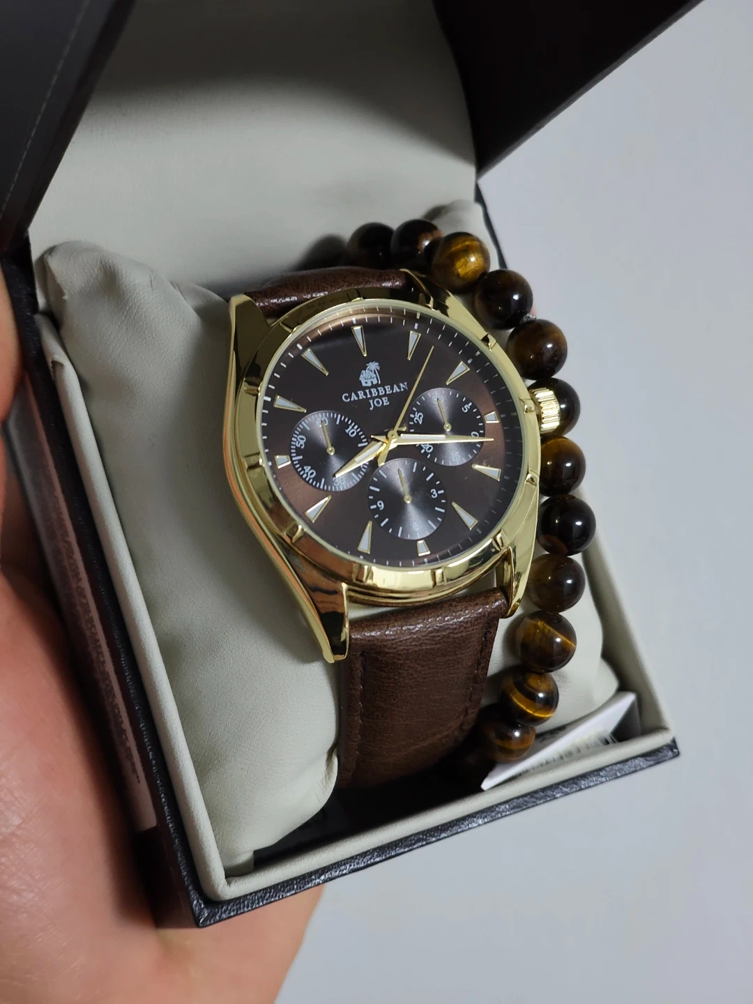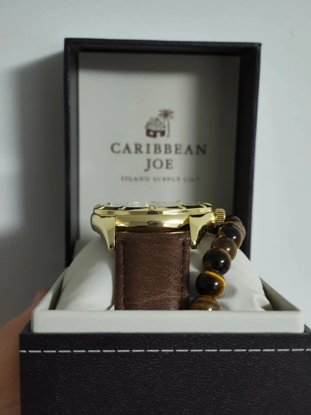 This Caribbean Joe watch comes with a brown leather strap. It includes a matching tiger eye beaded bracelet. The watch and bracelet are presented in their original box.