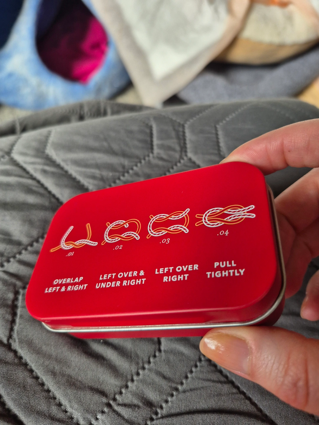 Small Altoids-sized red tin. Contains various miniature items for urgent situations. Ideal for hiking or camping.