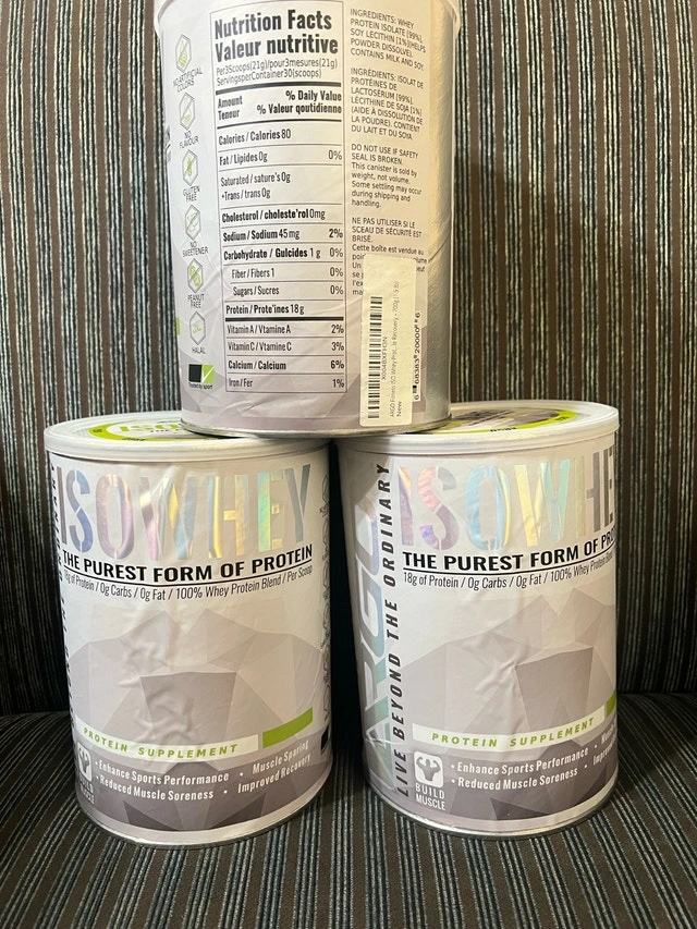 Selling three canisters of IsoWhey protein powder. Each serving offers 18g of protein with 0g of carbs and fats. These supplements are great for enhancing sports performance, building muscle, and reducing soreness after workouts. Asking $25 per canister. Cash accepted.