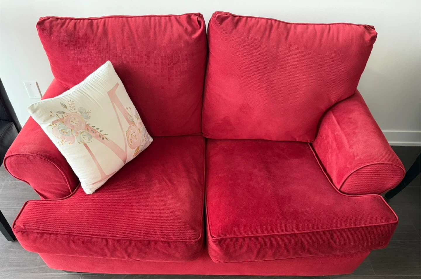 beautiful red two-seater couch! It’s in perfect condition and has been delicately used, making it a great addition to any living room, apartment, or cozy space.