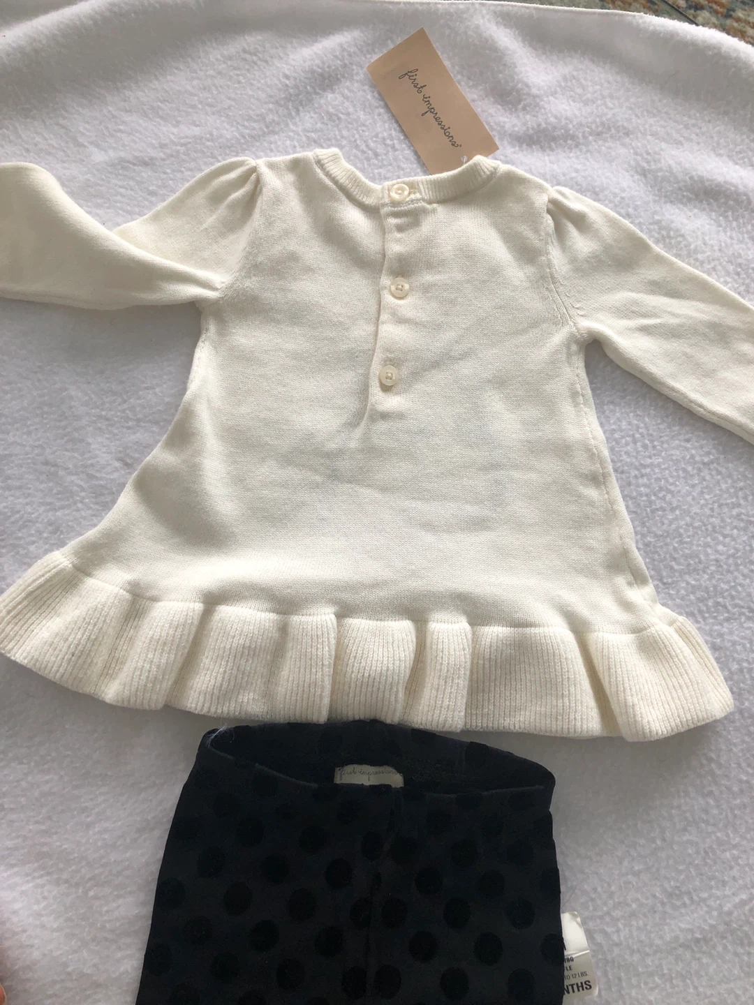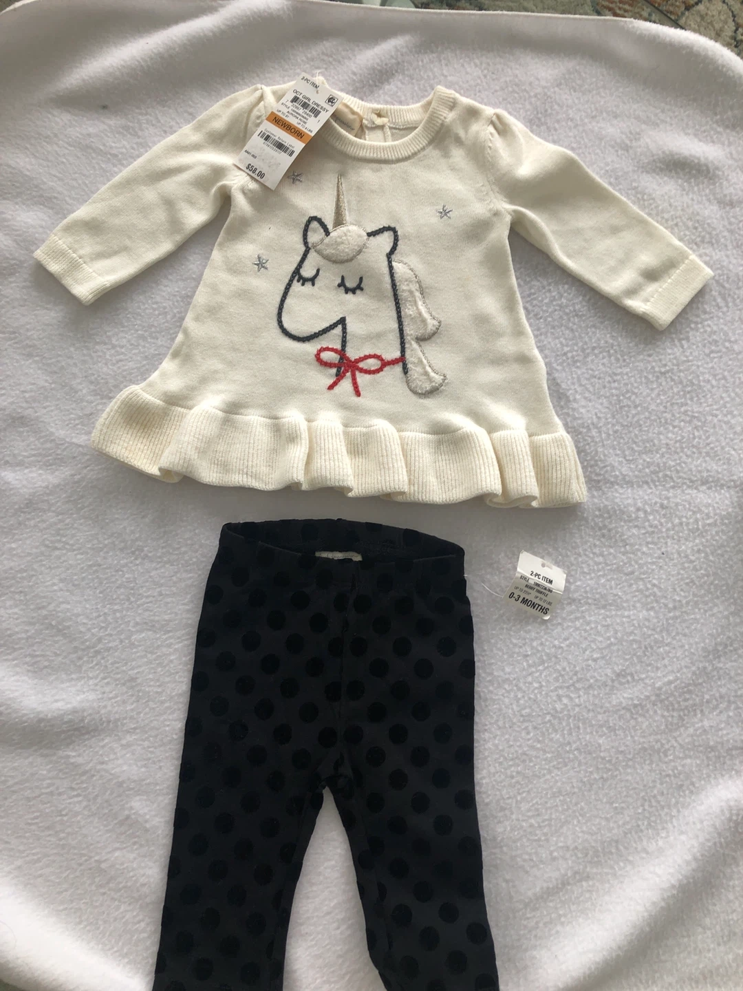 This NEW (label intact) adorable First Impressions 2-piece set includes a cream-coloured knitted dress with a unicorn applique and ruffled hem. It's paired with black leggings featuring a polka dot design.