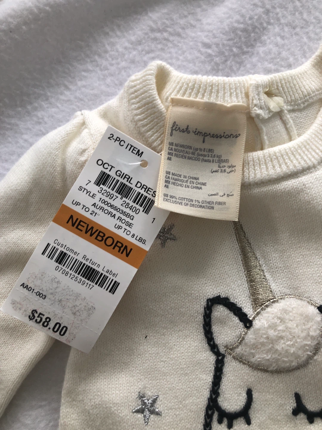 The dress is 99% cotton and 1% other fiber. Newborn size, fits up to 8 lbs. original price US $58 excluding taxes.
