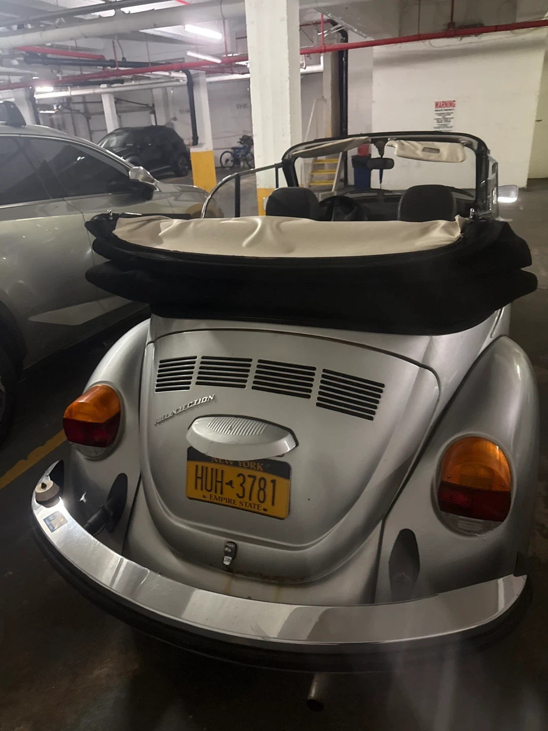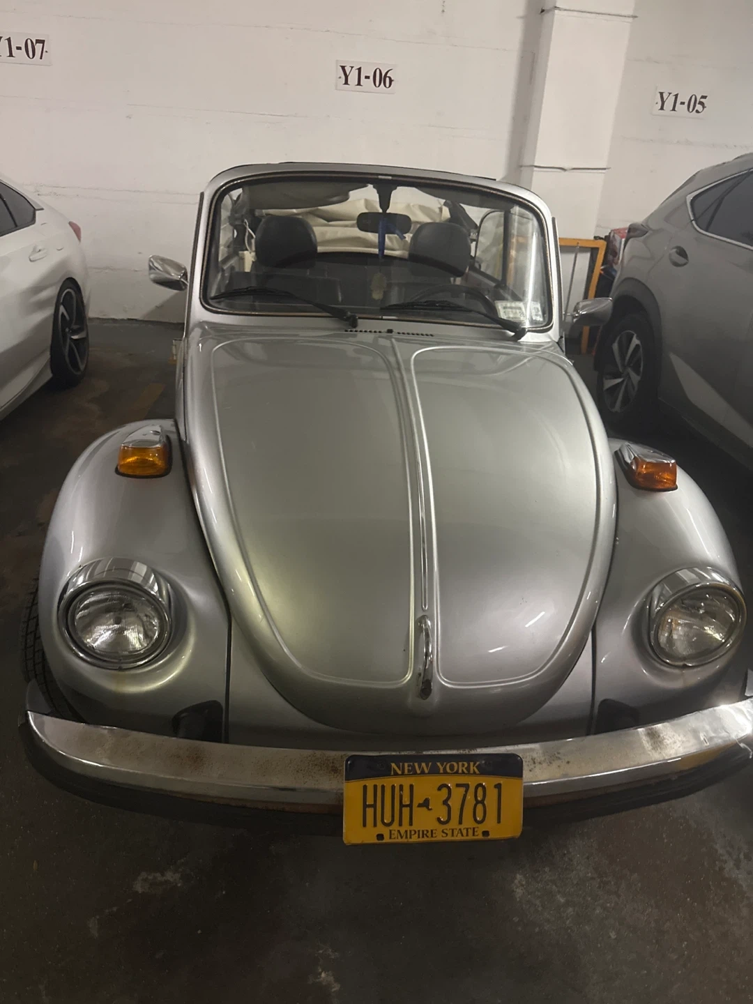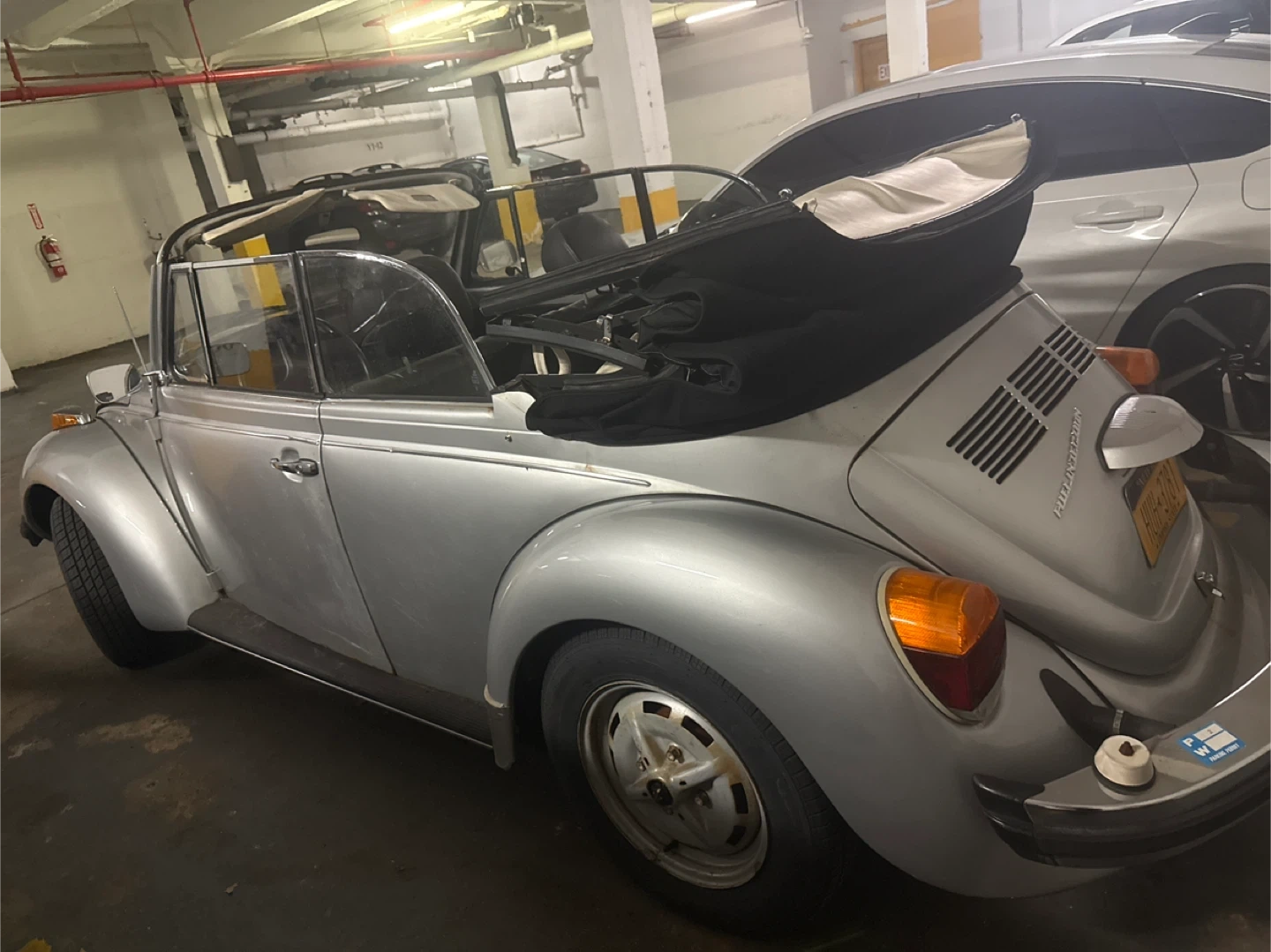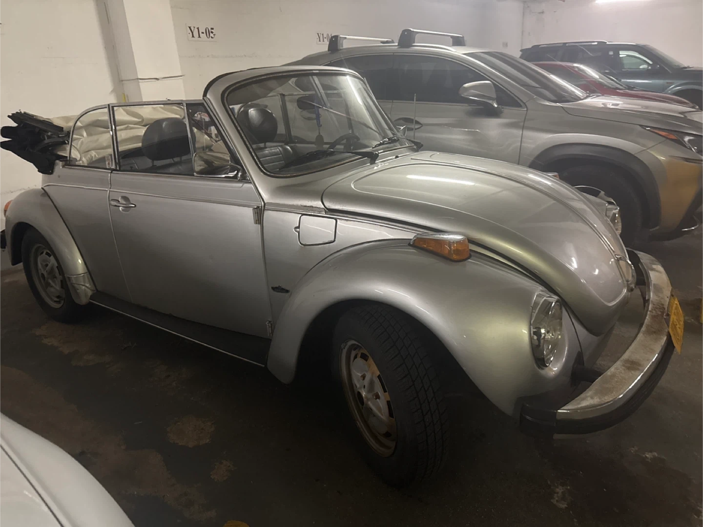 Selling a vintage Volkswagen Beetle convertible. It's a classic car with a unique style. The car is silver and has a convertible top. The license plate is visible in the pictures. Feel free to ask any questions!