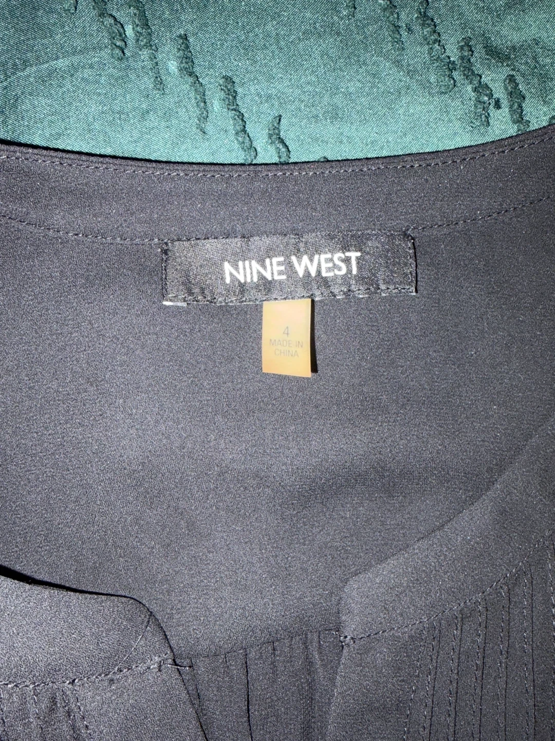 This is a black Nine West dress with a size 4 tag. It features a V-neckline with pleats down the front and short, flutter sleeves.