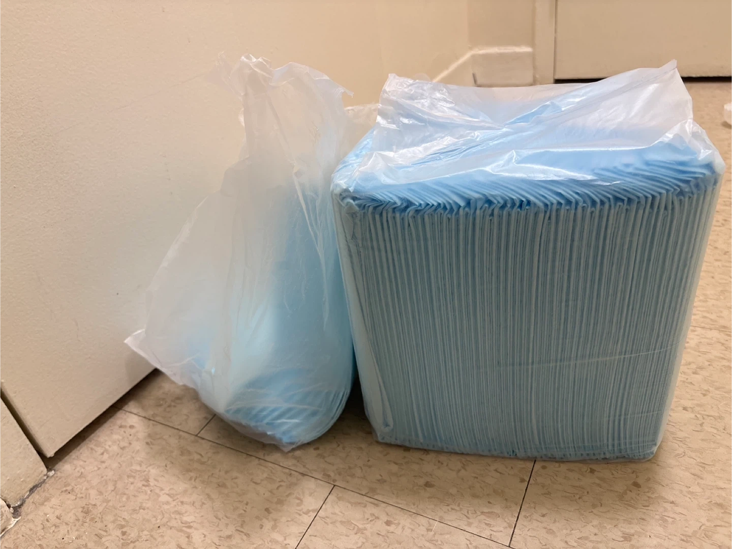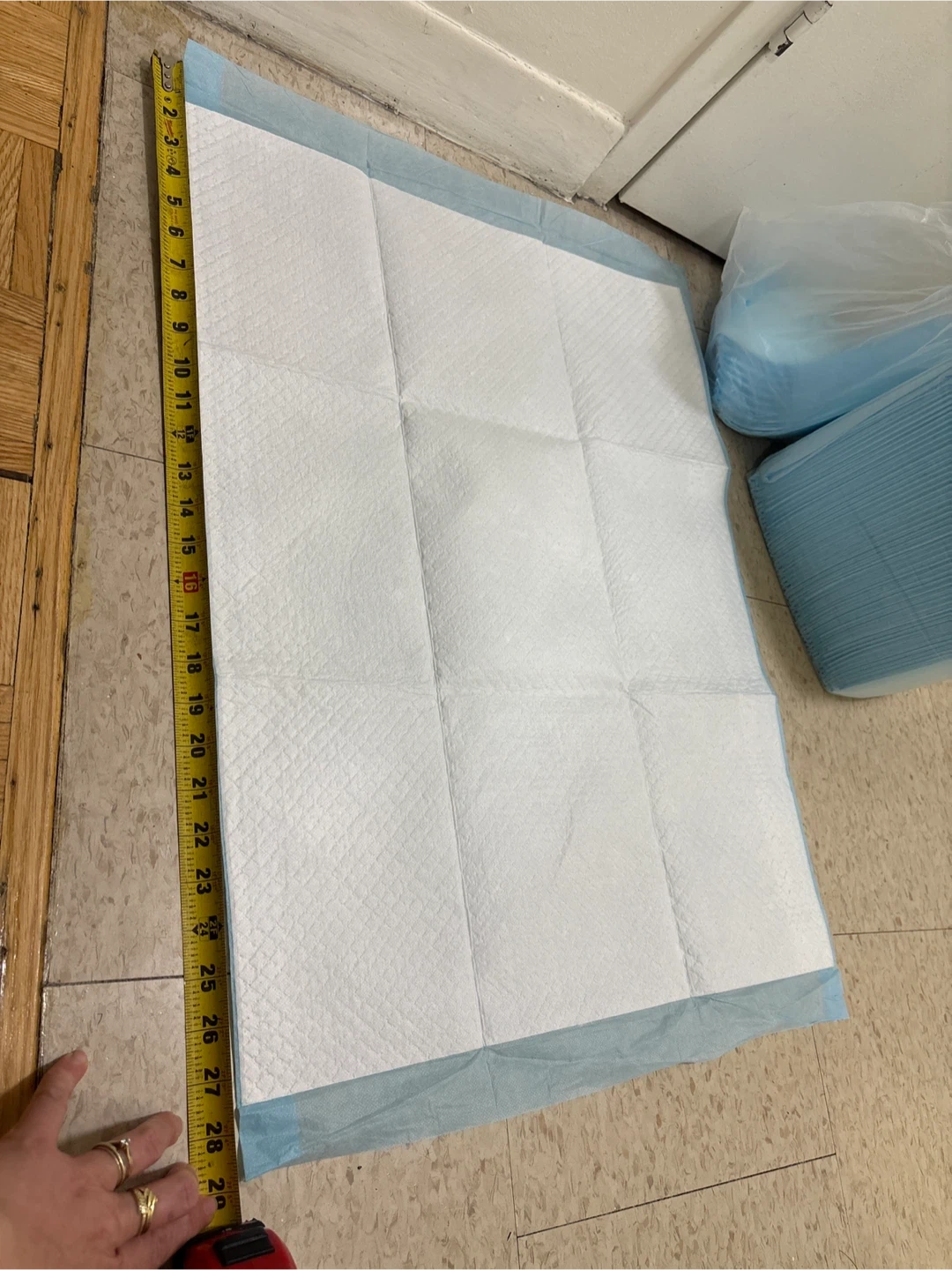 Bundle of blue pet training pads, roughly 23 inches by 23 inches. Comes in a large bag with a substantial stack of pads. These are handy for housebreaking or protecting surfaces. 61 pads