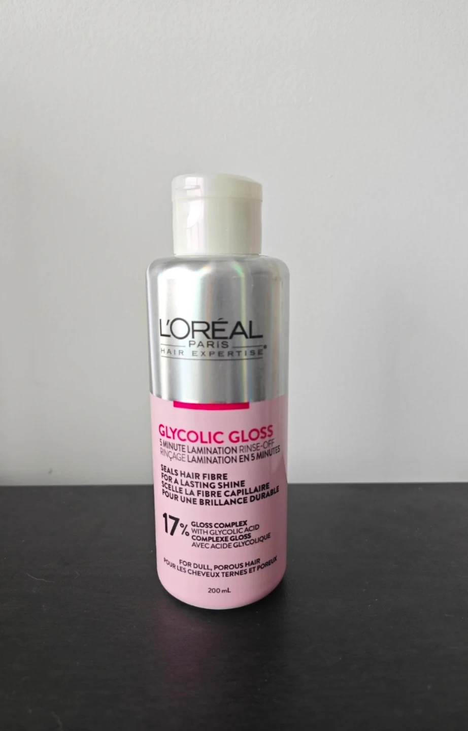L'Oréal Paris Glycolic Gloss 5 minute lamination rinse-off seals hair fibre for a lasting shine. It has a gloss complex with glycolic acid. 200 mL bottle.