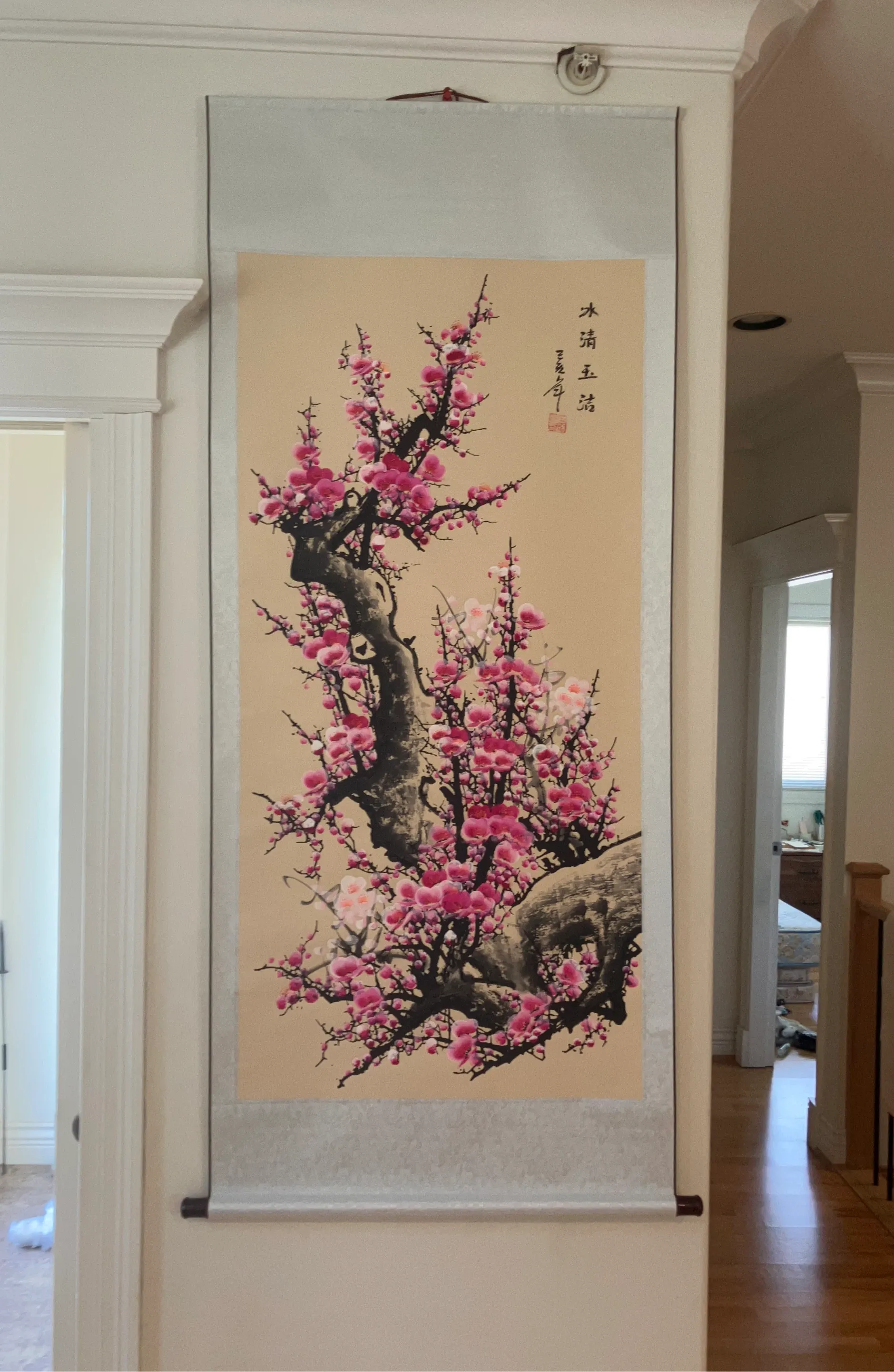 Beautiful vintage scroll painting featuring a detailed depiction of cherry blossoms on a textured background. It has traditional calligraphy and a red seal, adding an authentic touch. This piece would bring an elegant artistic flair to any space!