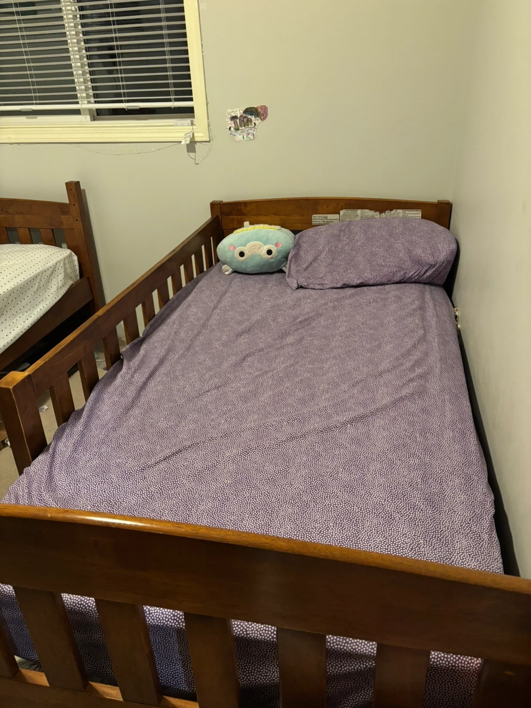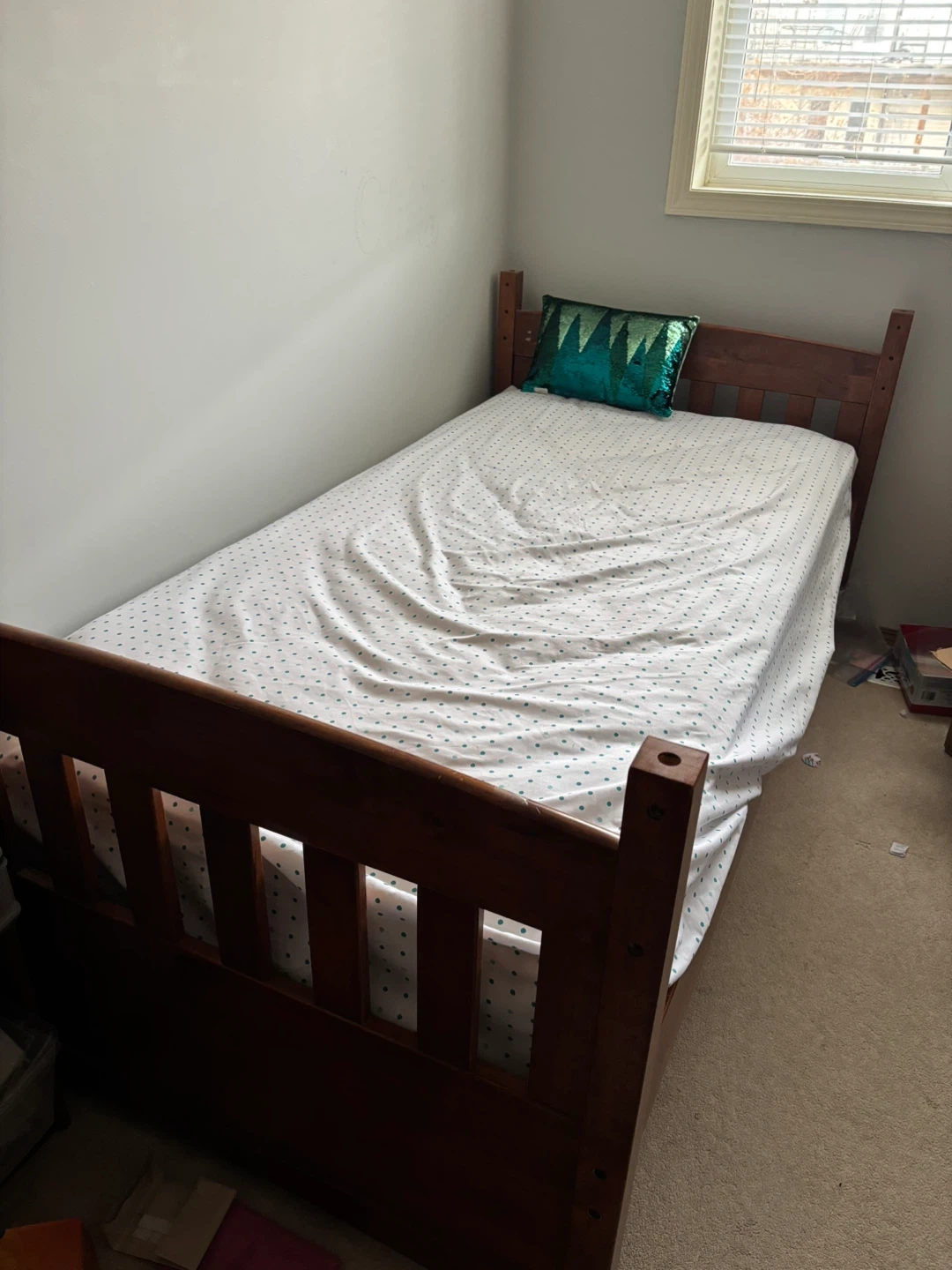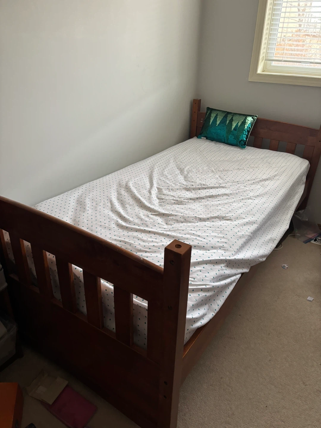 Two Sturdy wooden single beds with protective rails, can turn into bunk beds. Mattress are not included.
