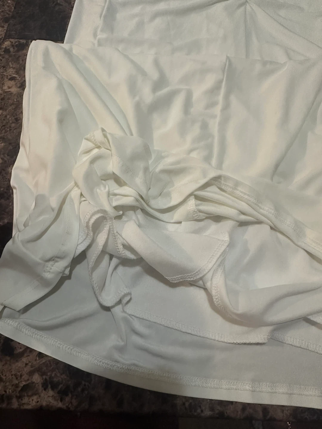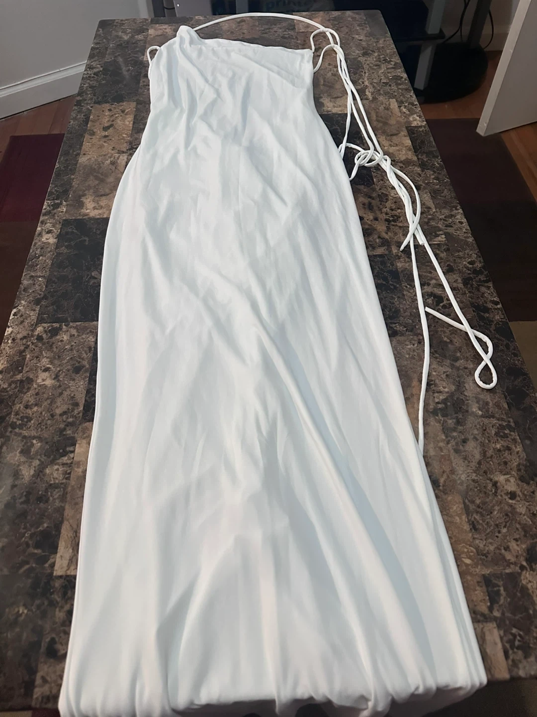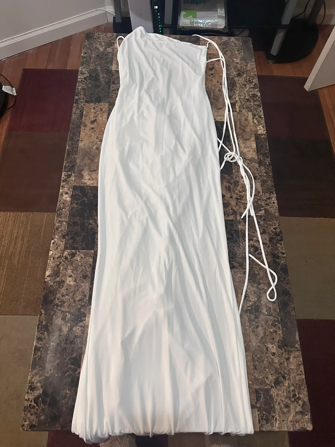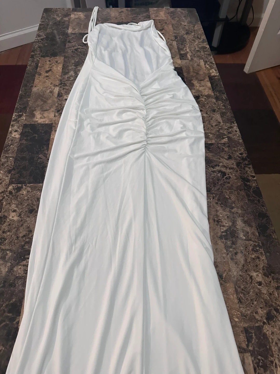 White ruched maxi dress with a one-shoulder neckline and adjustable tie straps. The fabric has a slight sheen and drapes beautifully. It's designed for a form-fitting silhouette.