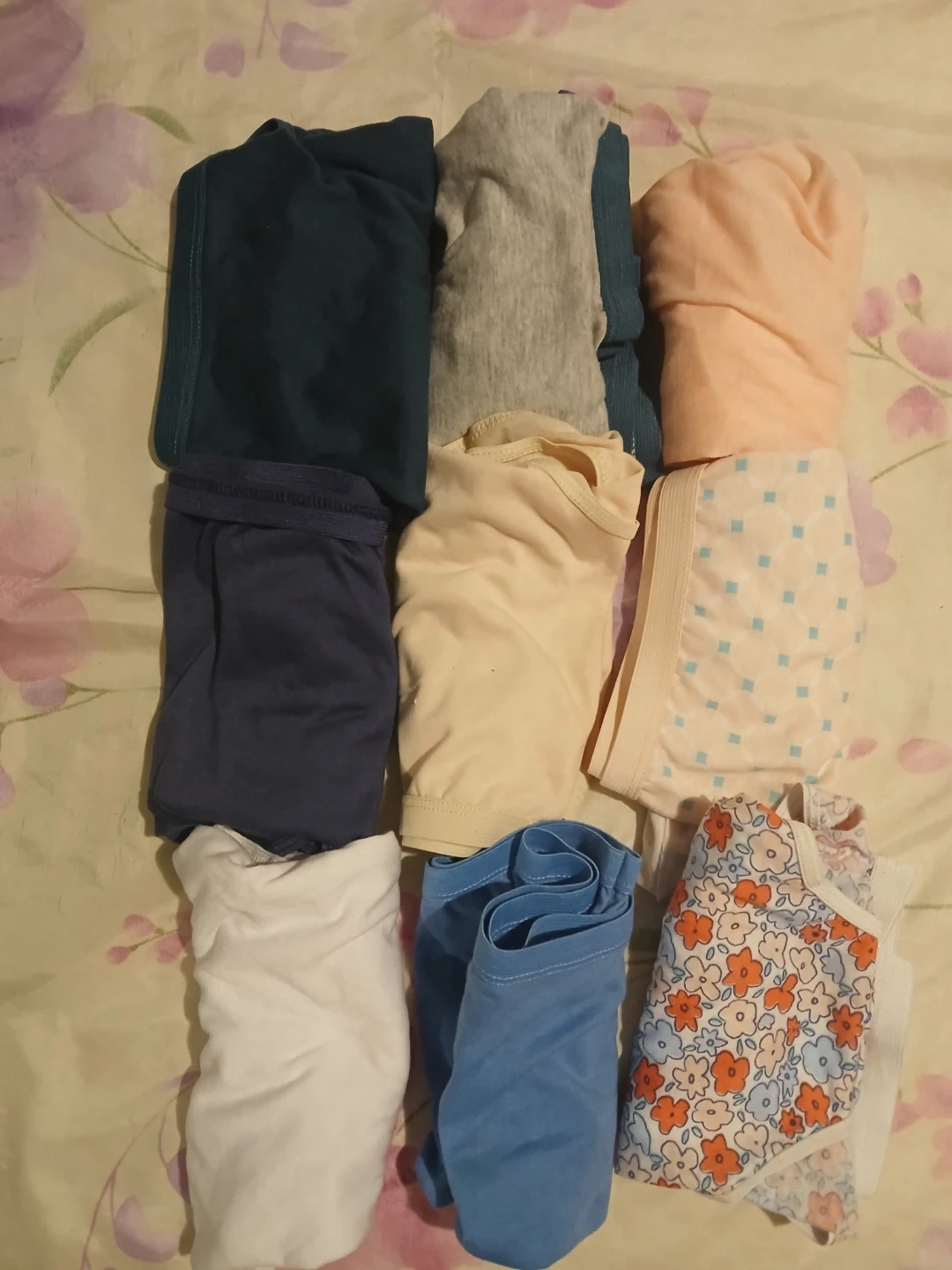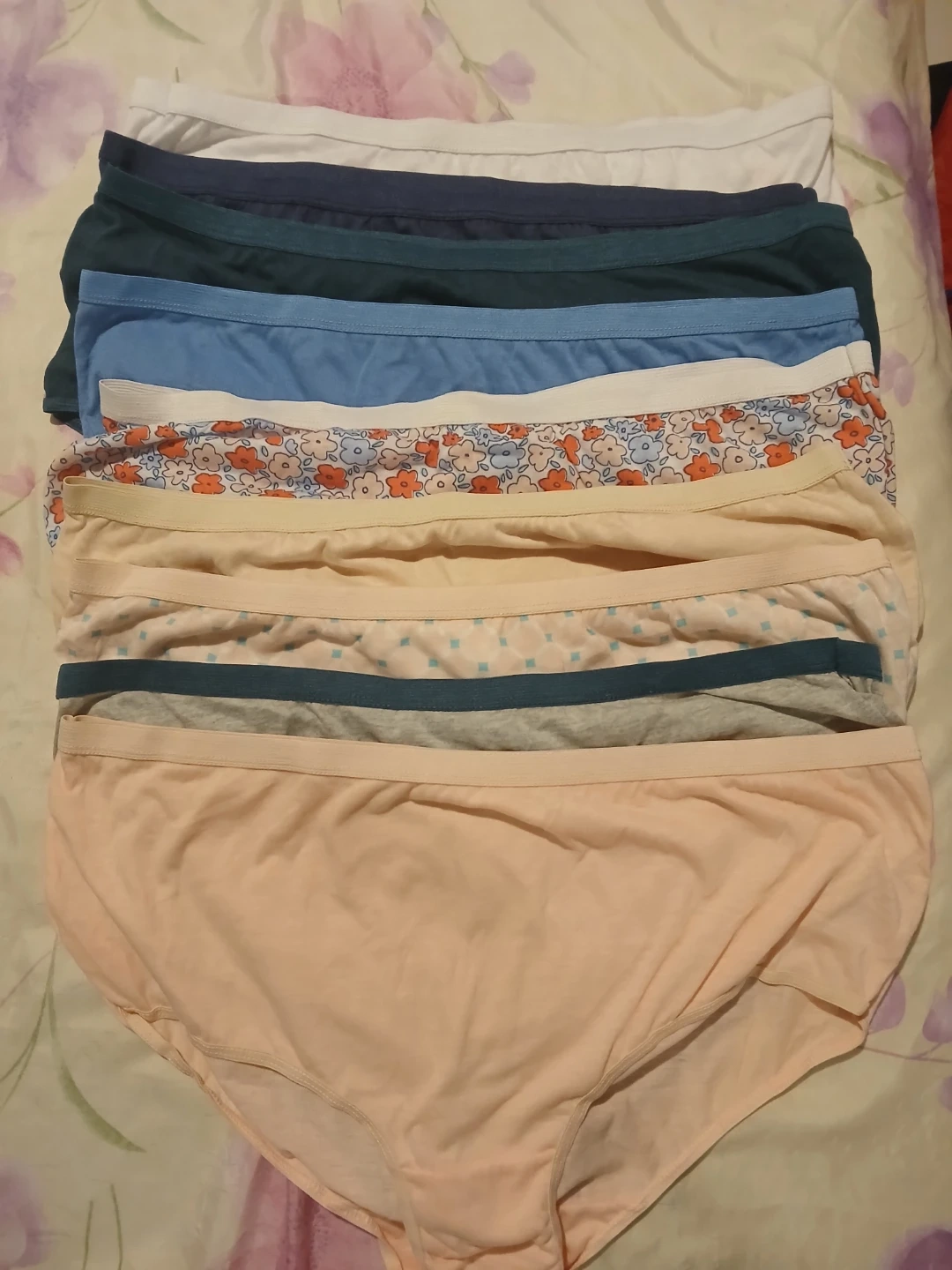 A pack of nine women's underwear in various colors and patterns. Includes solid colors like teal, navy, light pink, and white, as well as floral and geometric prints. Made from comfortable fabric. Size is 2XL. Unused without tags