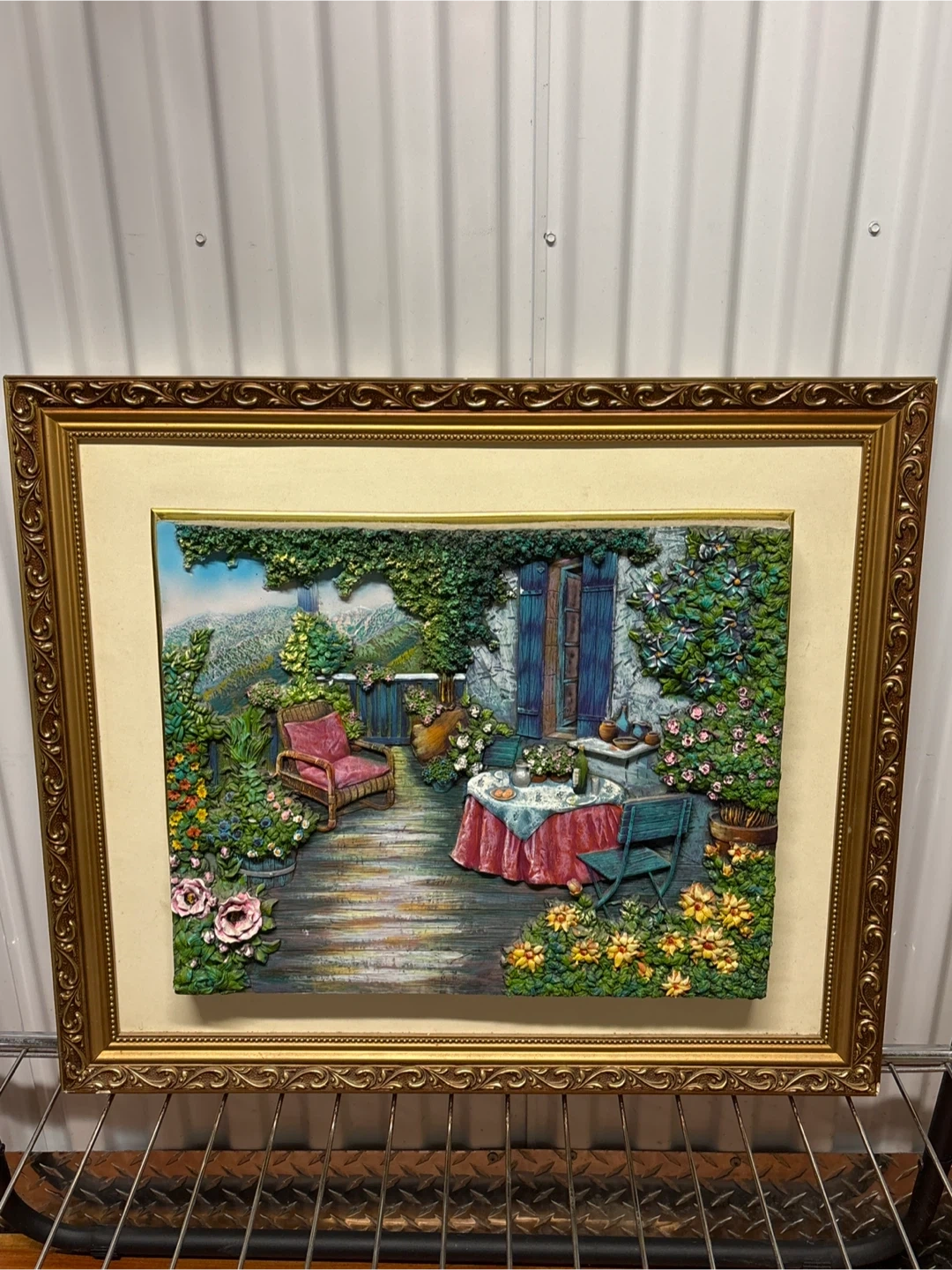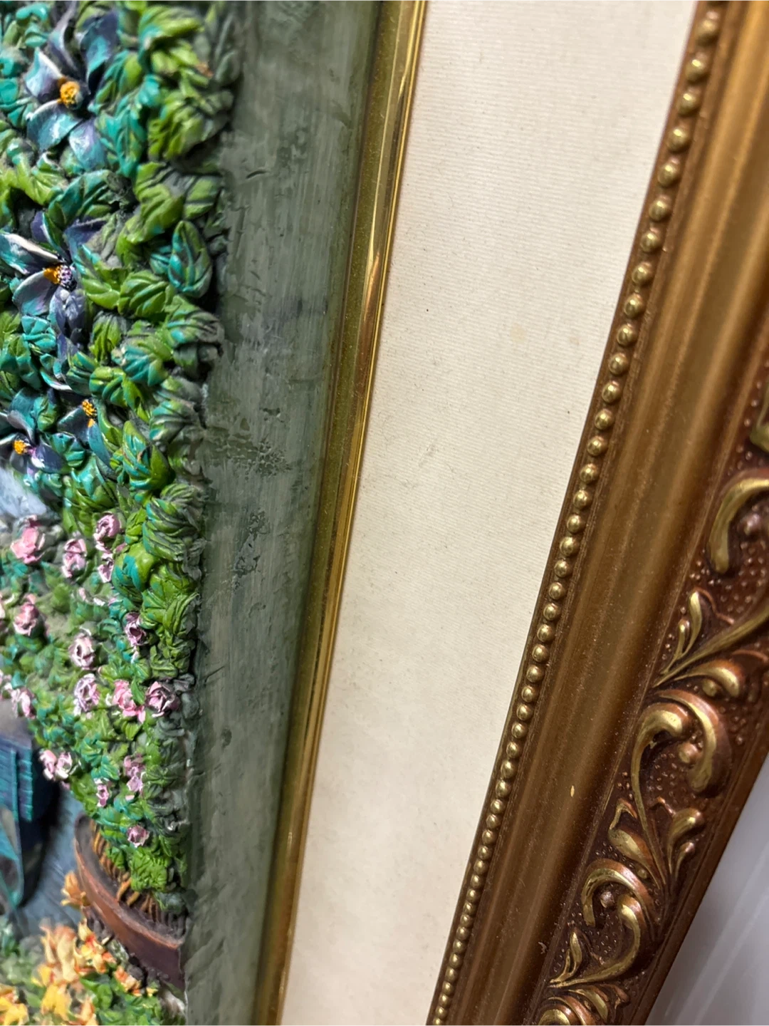 Beautiful framed 3D art piece depicting a floral garden scene. The frame is ornate and golden, adding a touch of elegance to the detailed artwork. Perfect for adding a touch of nature and charm to any room