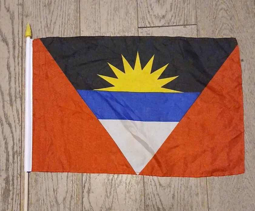 This is a handheld flag of Antigua and Barbuda. It's made of fabric and attached to a white pole with a yellow tip. The flag features the distinctive design with black, yellow, blue, and white colors.