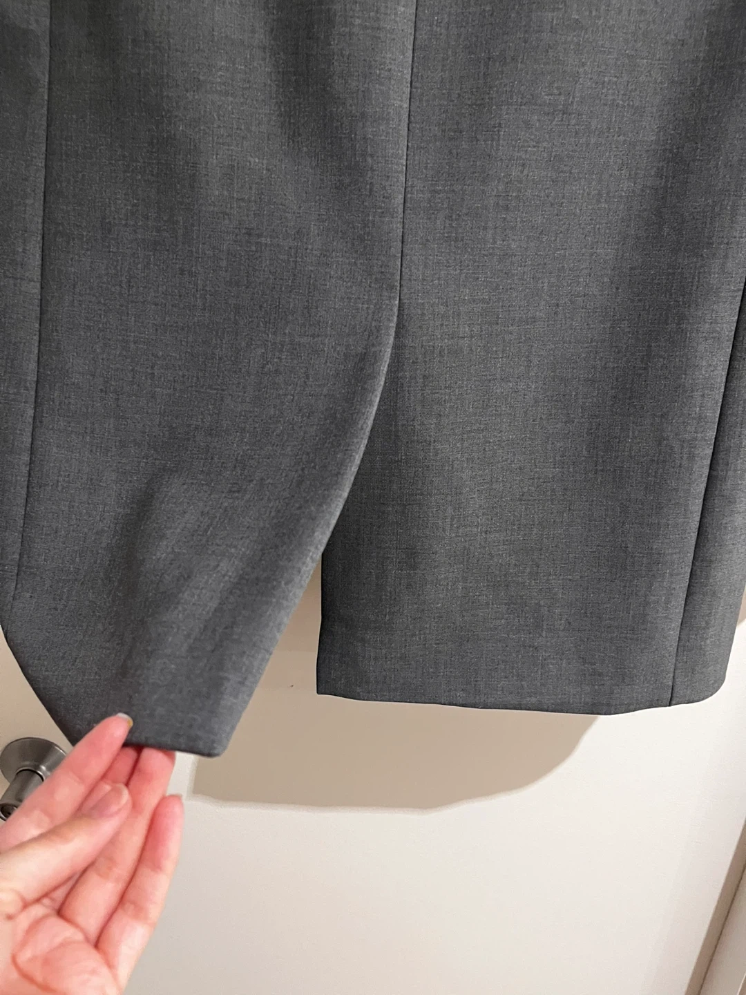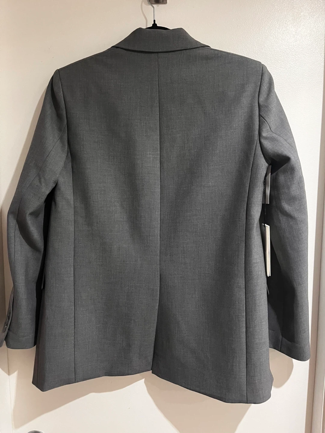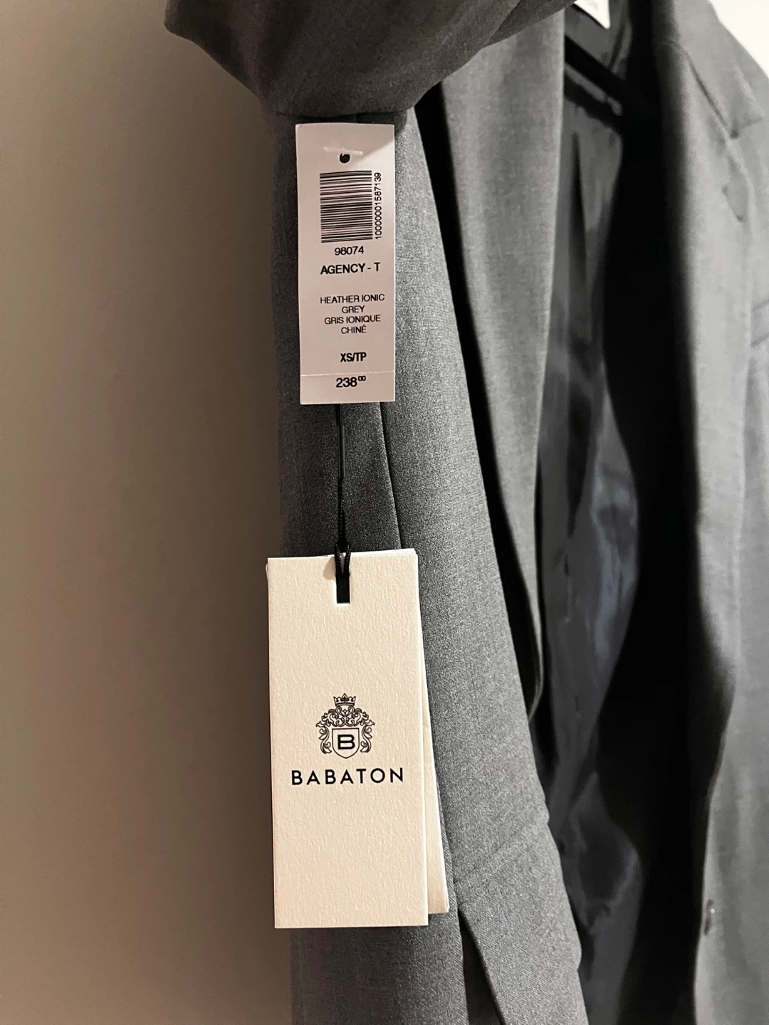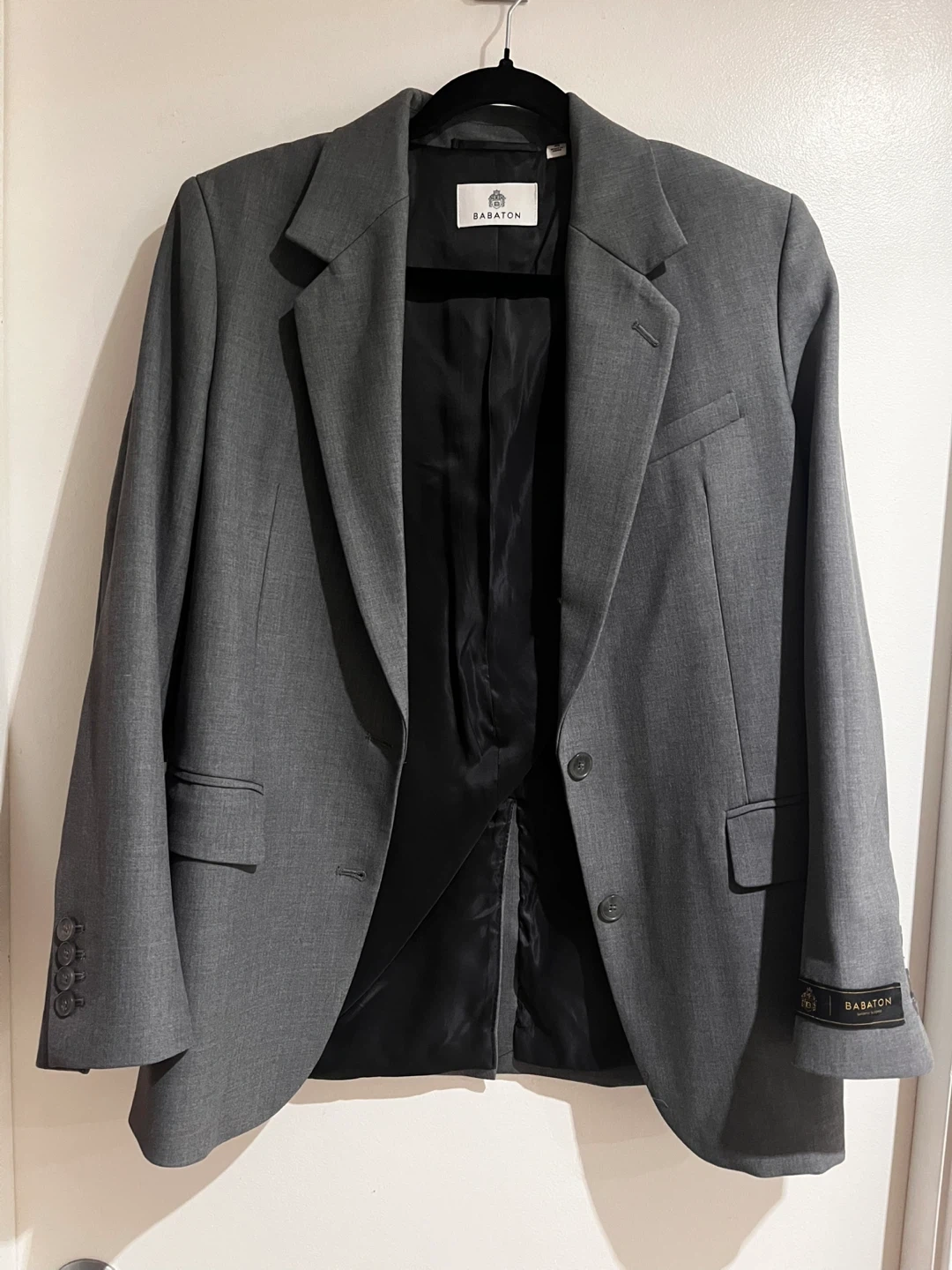 This is a NEVER WORN grey suit jacket by Babaton. It's made from a blend of recycled polyester, viscose, cotton, and elastane. The sleeve lining is cupro and polyester. Please see original price point ($238). Only selling because it doesn’t fit me.