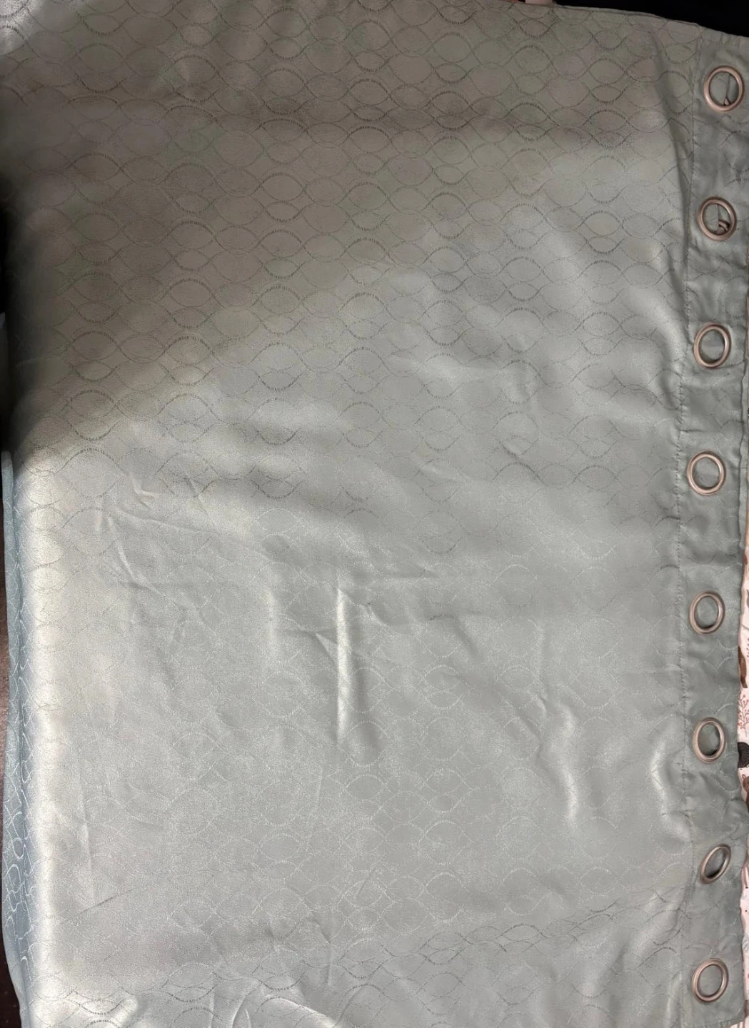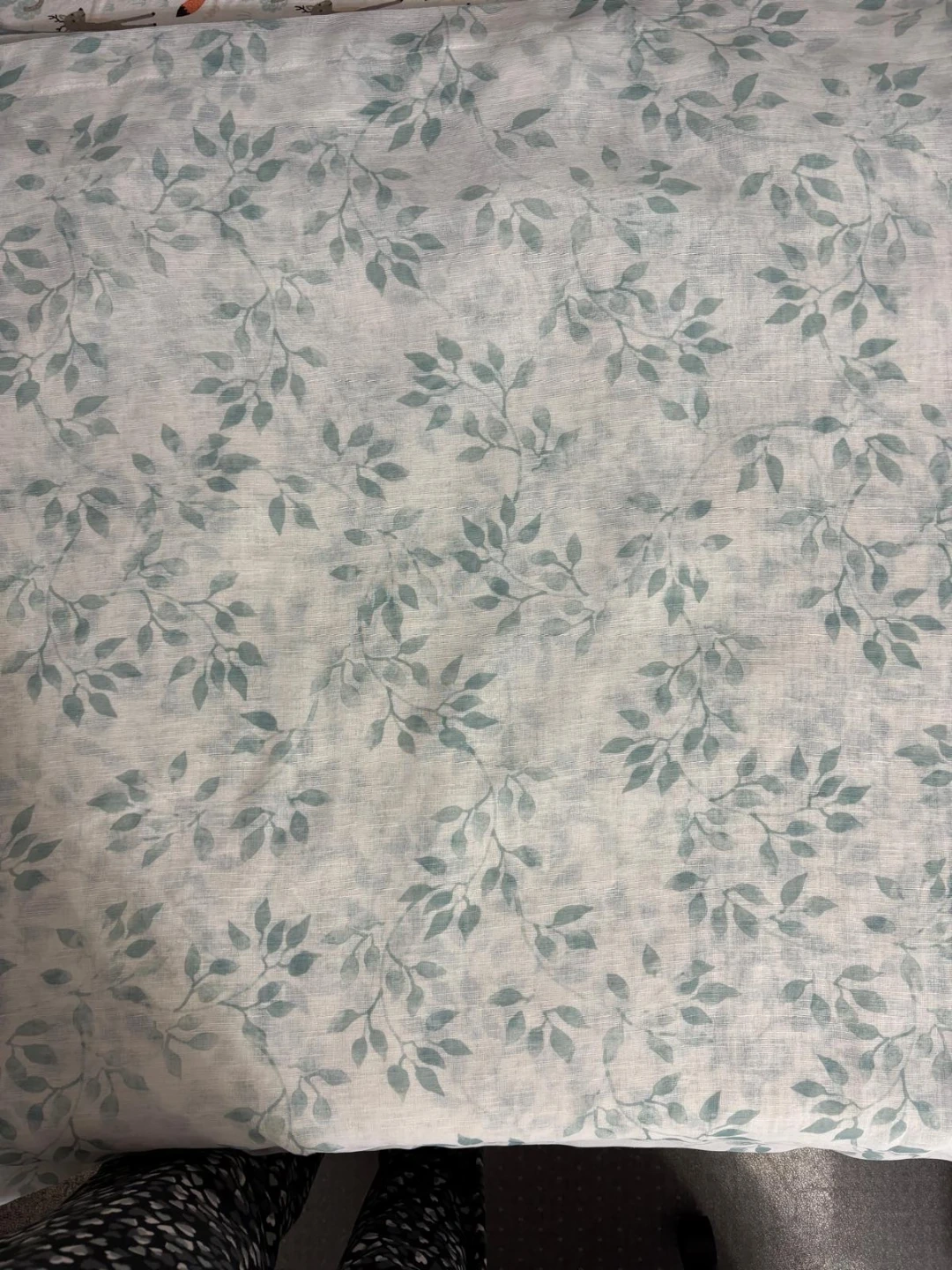 Beautiful fabric with a subtle green leaf vine print on a white background. It's a lightweight material, perfect for crafting or home decor projects. Comes with a second piece of light green fabric with a textured pattern and grommets.