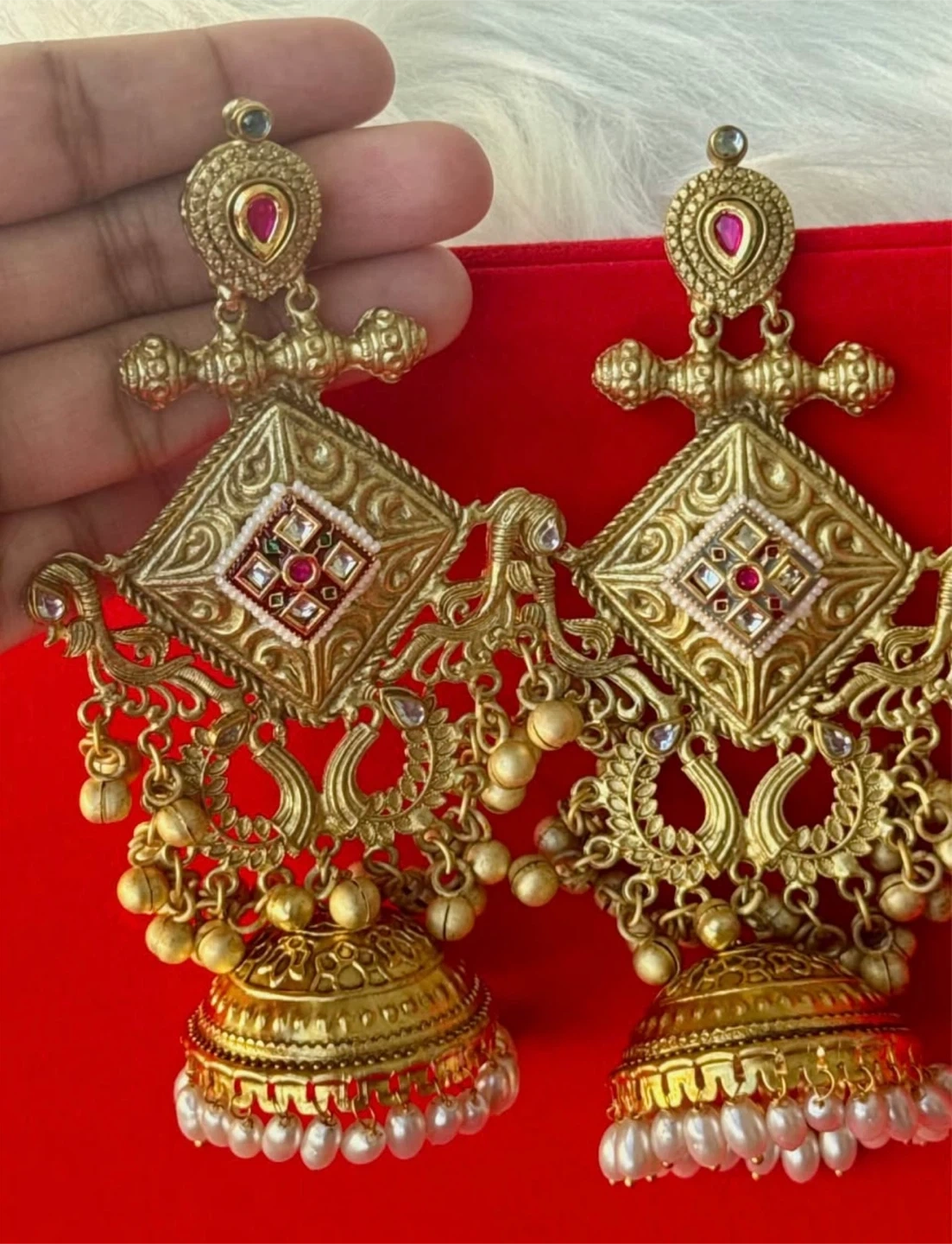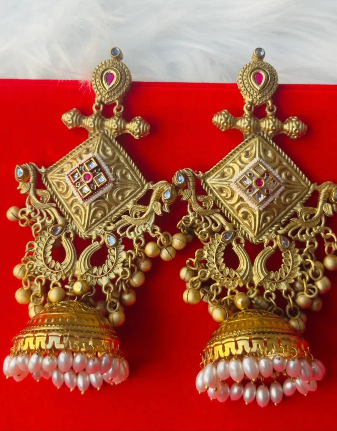 Kashmiri Beautiful gold-tone jhumka earrings with intricate detailing. They feature pearls and small red stones. These earrings are perfect for adding a traditional touch to any outfit!