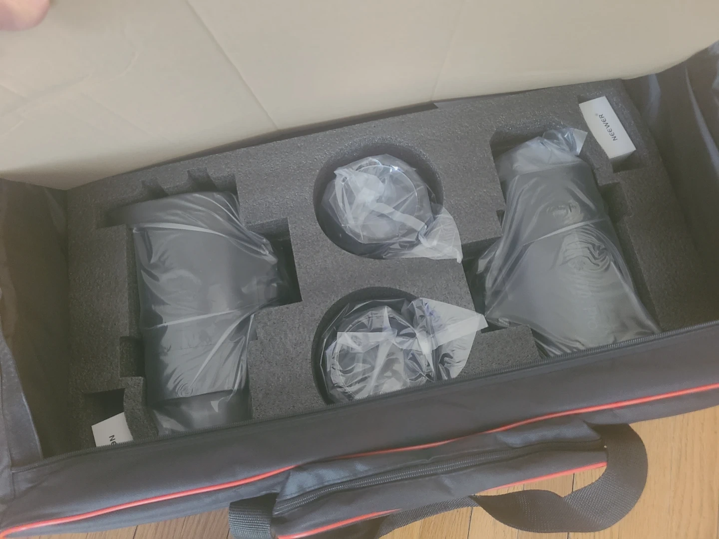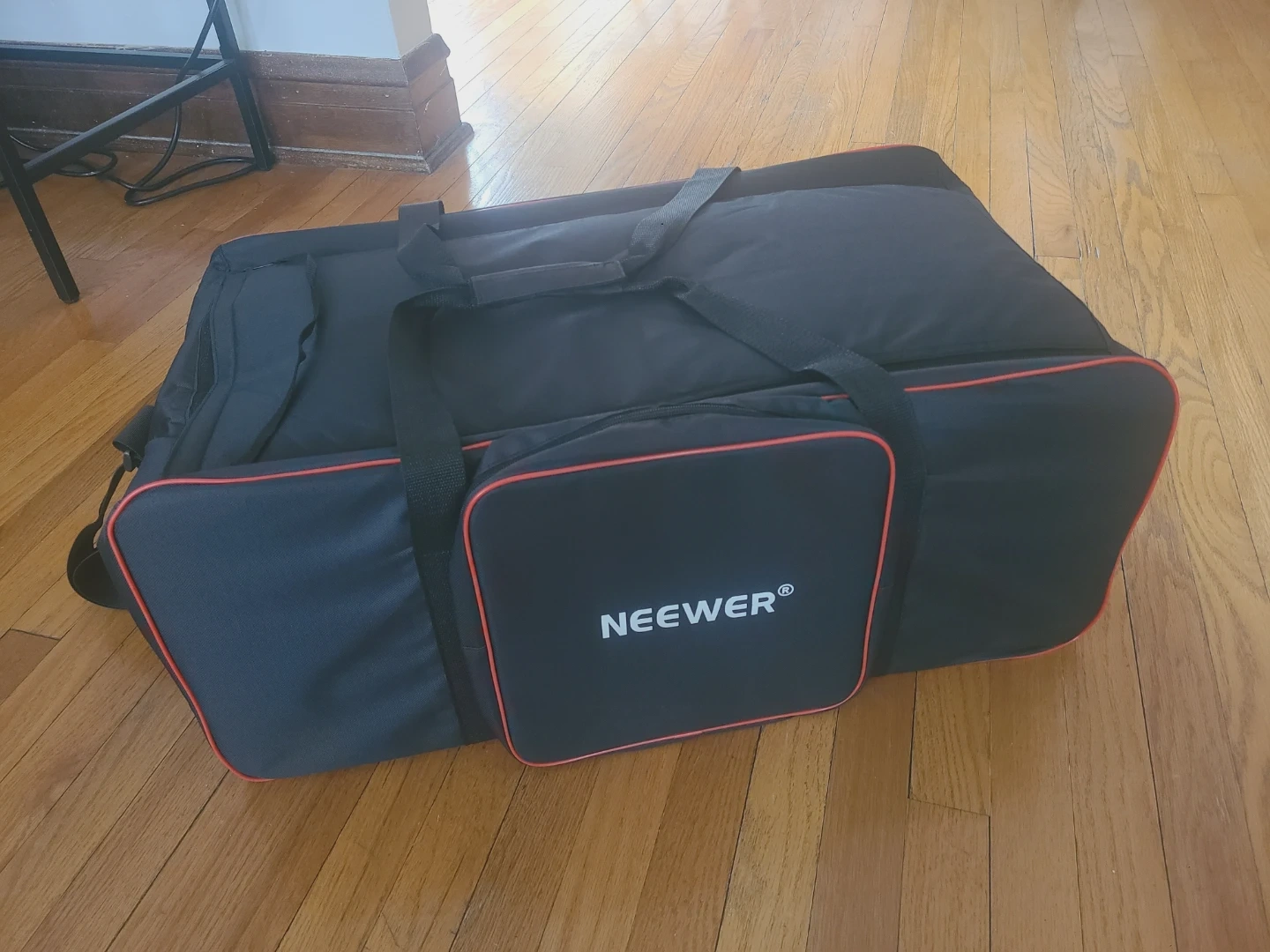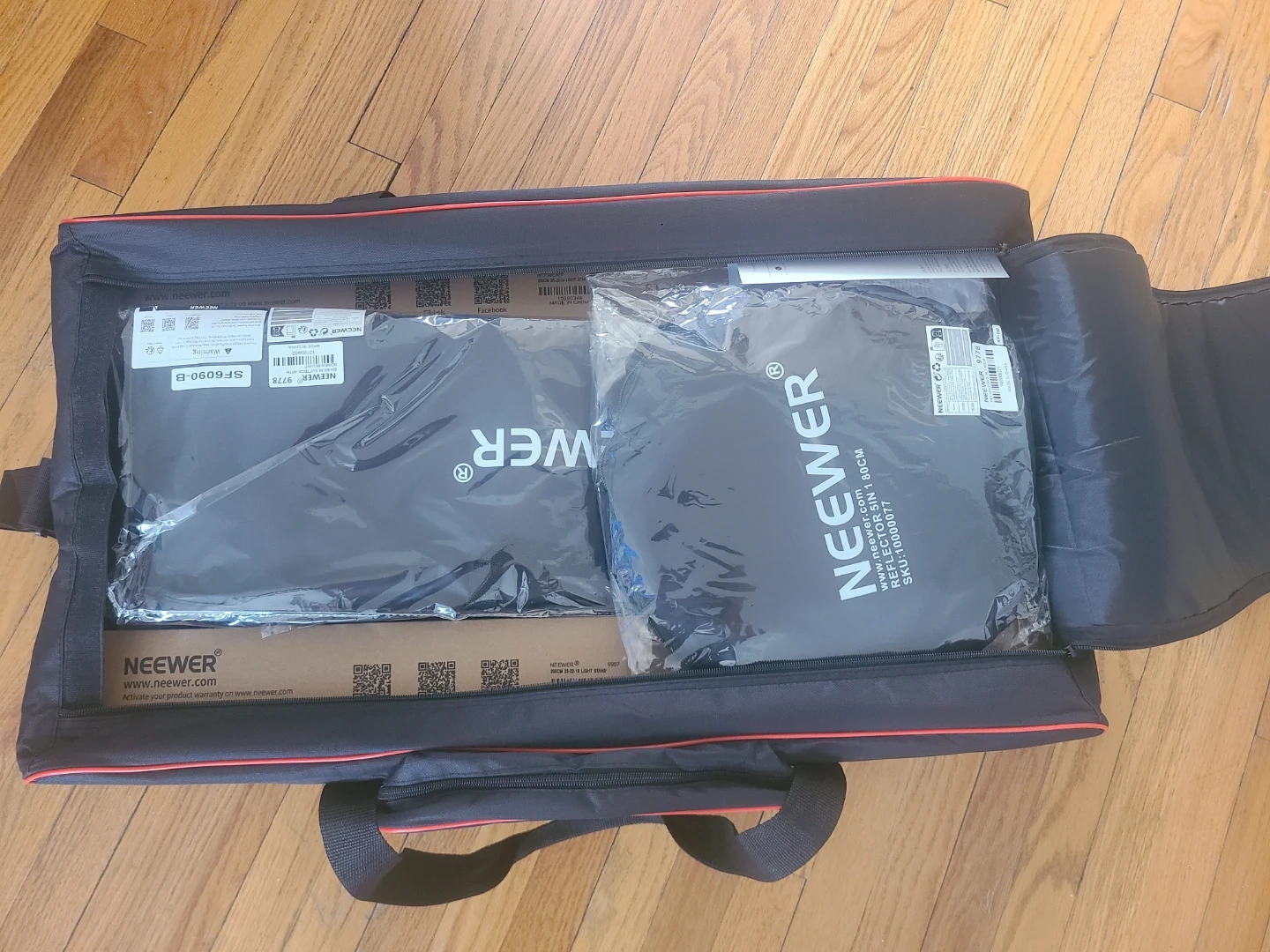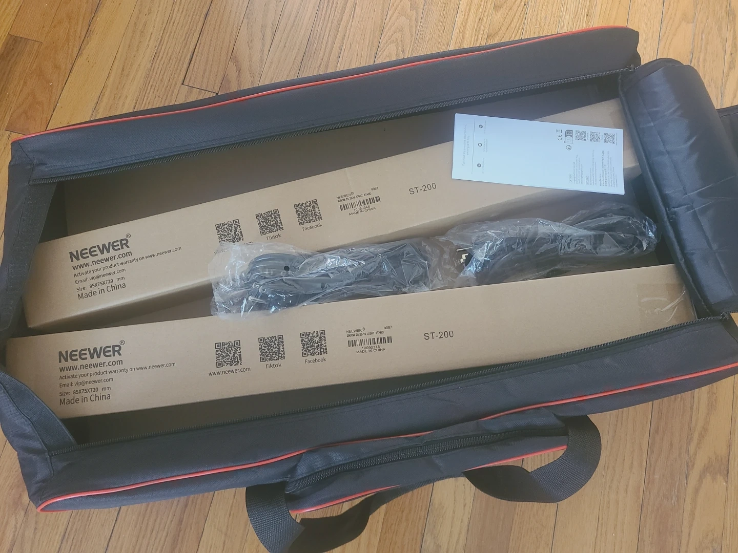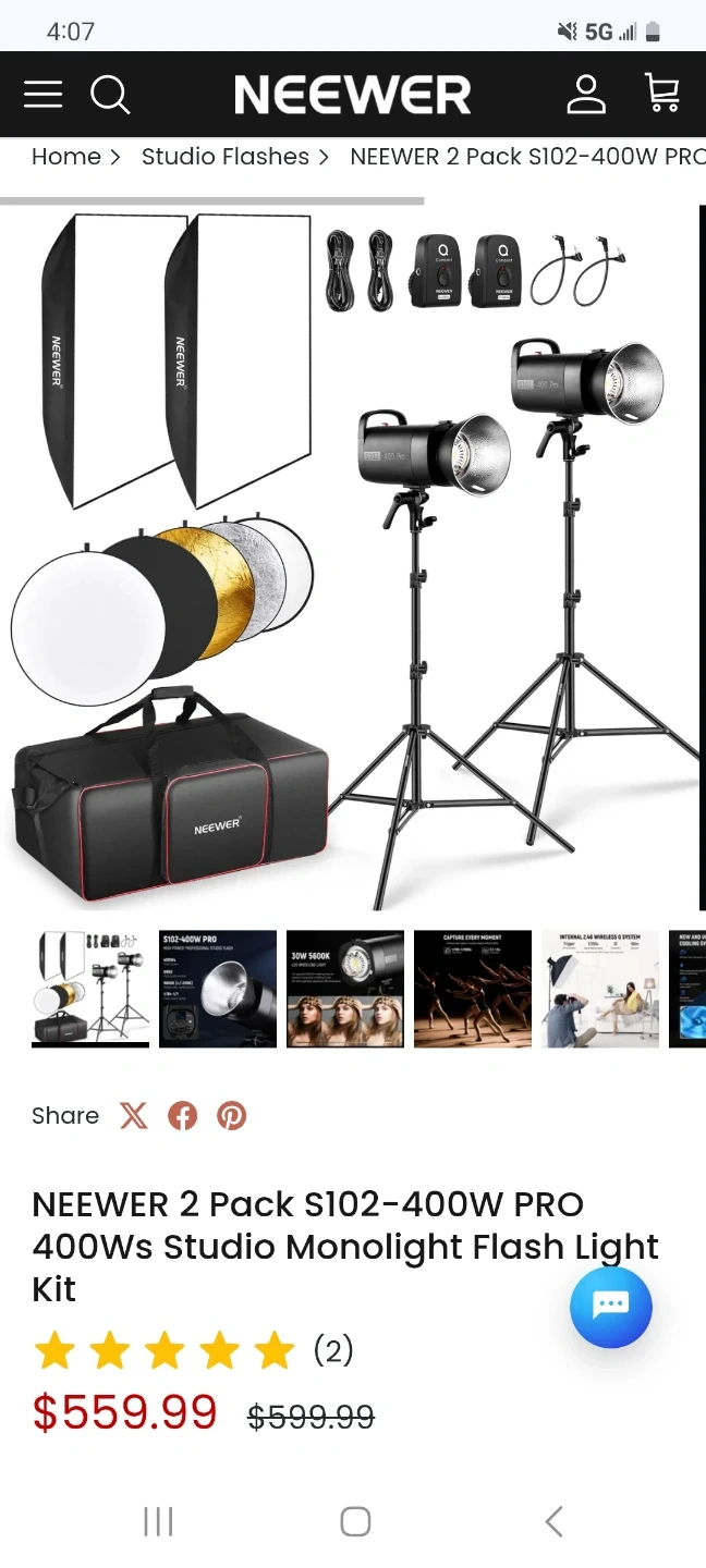 The equipment is never used and still in original packaging. NEEWER 2 Pack S102-400W PRO 400Ws Studio Monolight Flash Light Kit You will get: - Carrying bag - 2 x Monolight (with Modeling Lamp) - 2 x 2.46 Trigger - 2 x Standard Reflector - 1x 5 in 1 Reflector - 2 x Power Cord - 2 x Light stand - 2 x Softbox