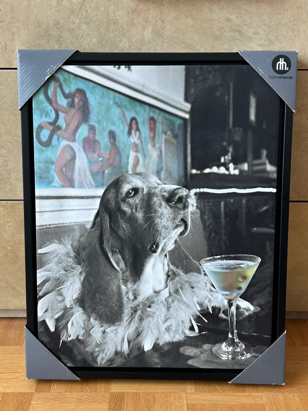 This HomeTrends art print features a Basset Hound dressed up with a feather boa, holding a martini.