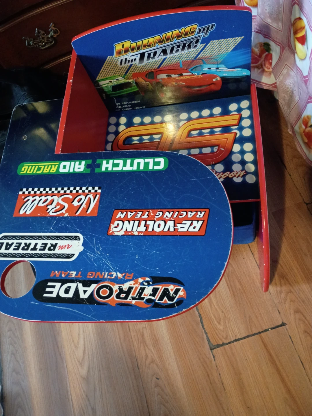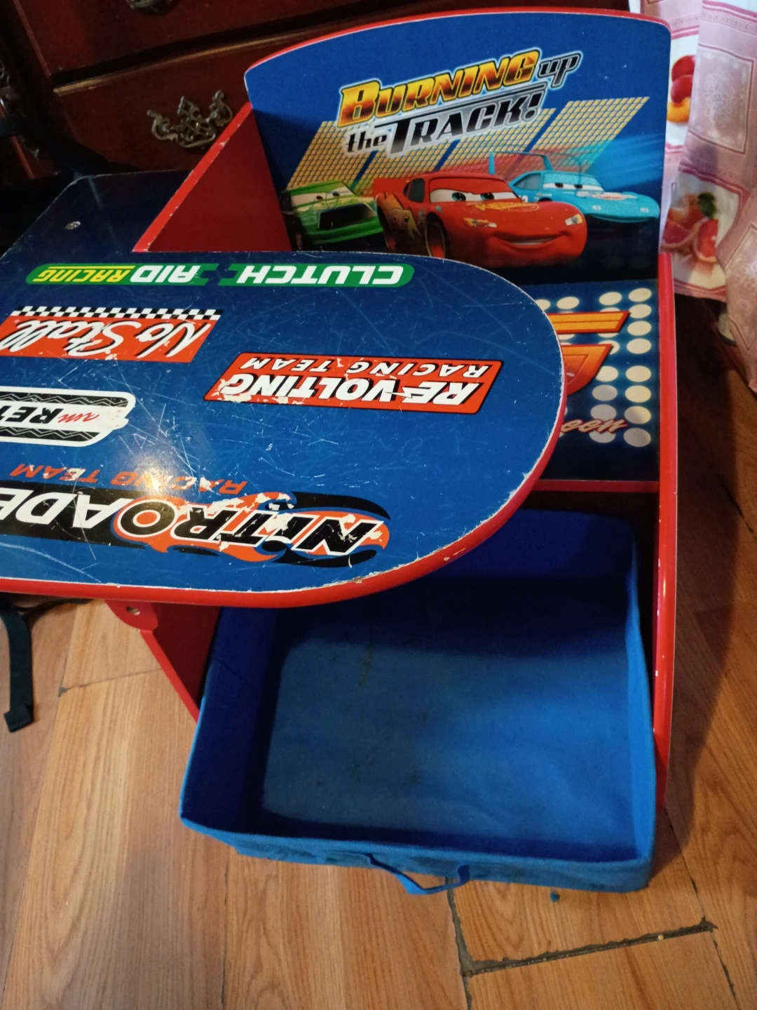 This kids' storage shelf features designs from Disney's Cars movie. It has a "Burning Up the Track!" theme with Lightning McQueen and other characters. It includes a blue fabric storage bin.