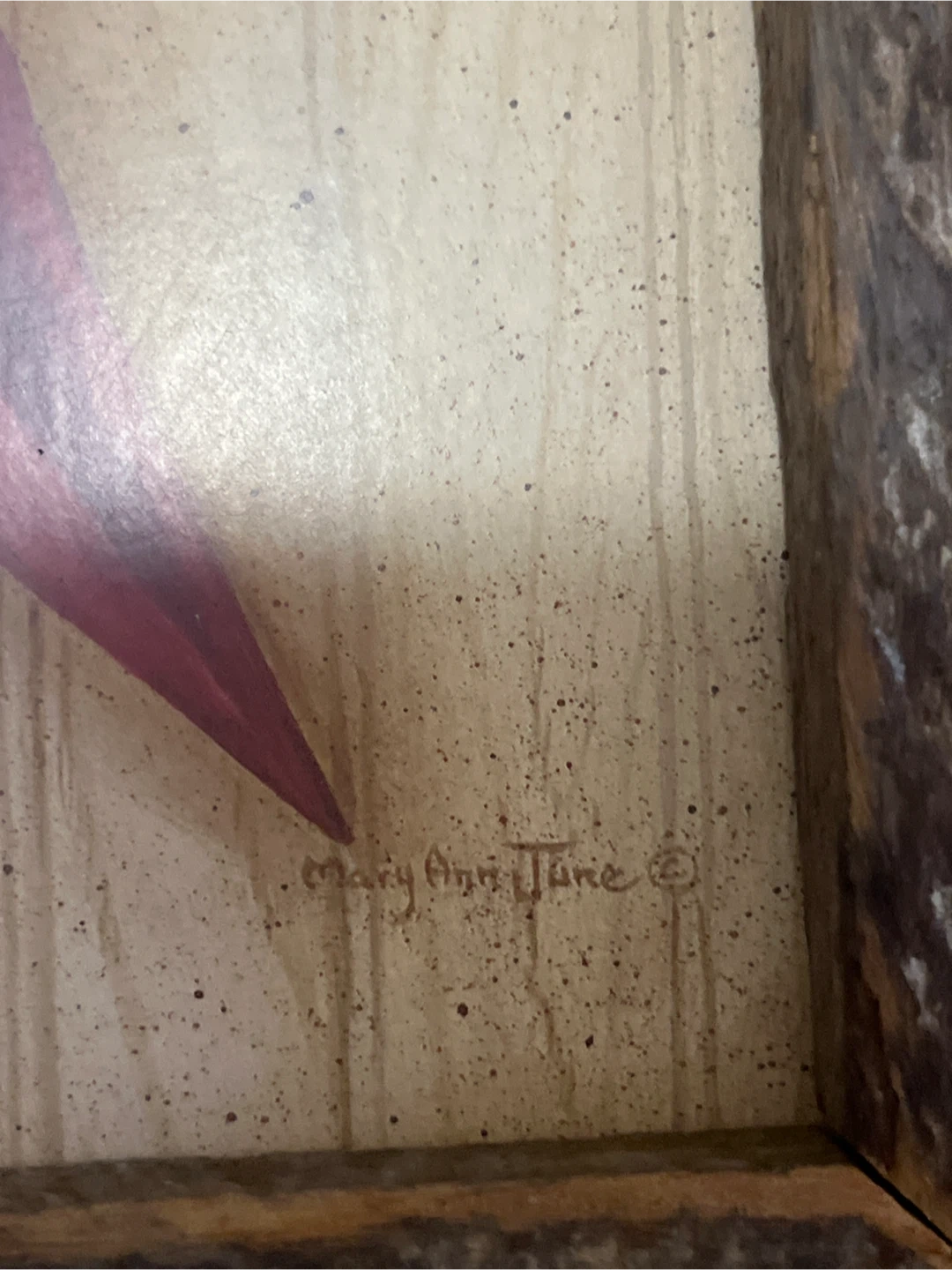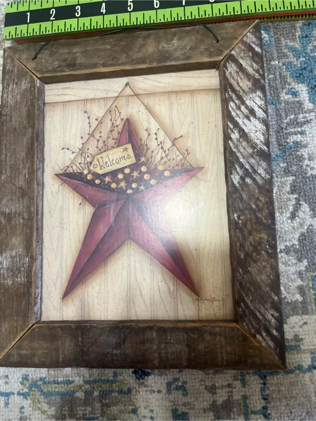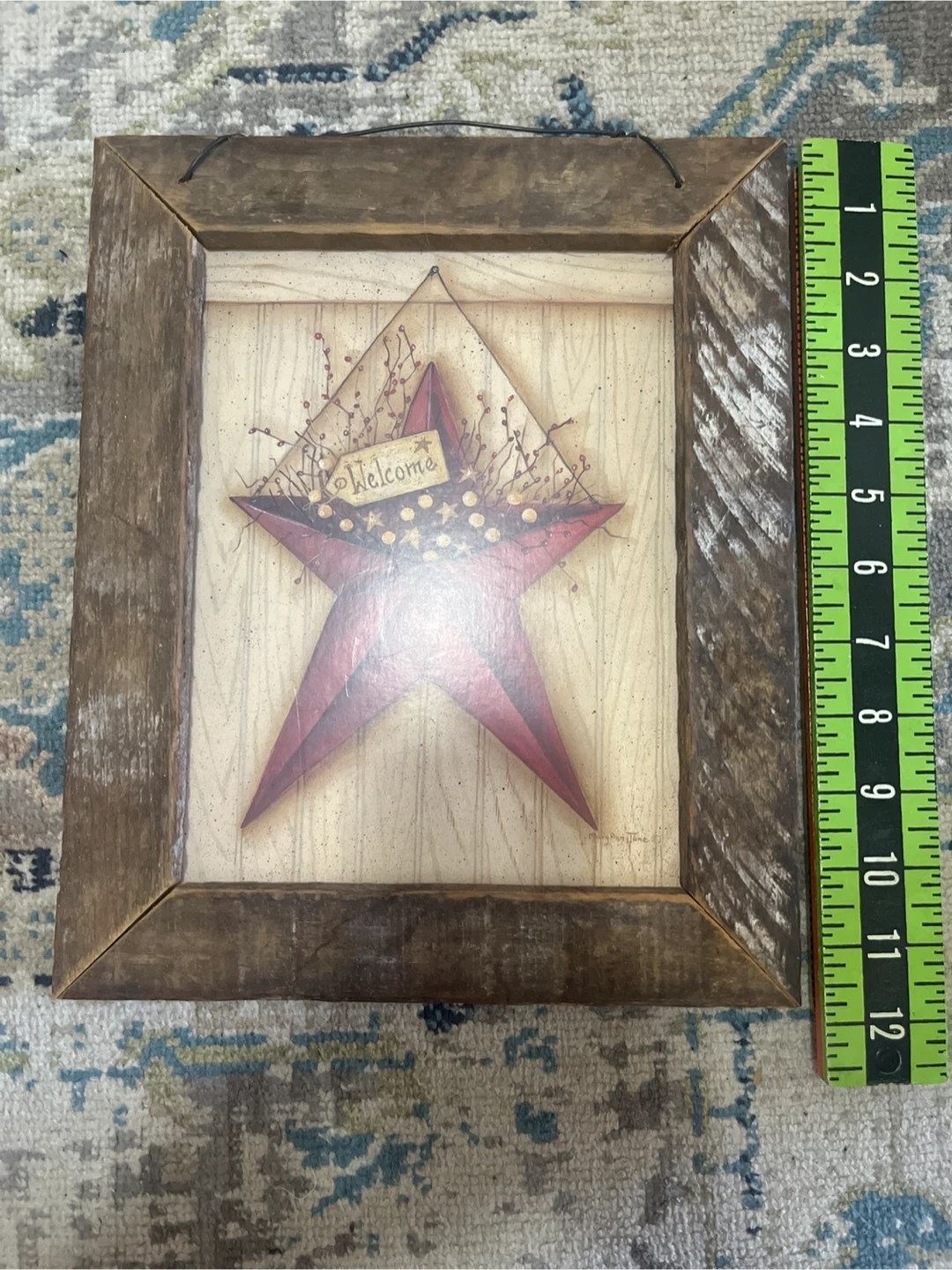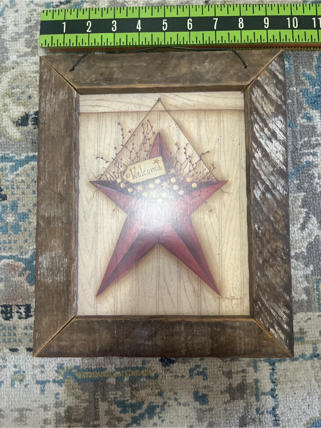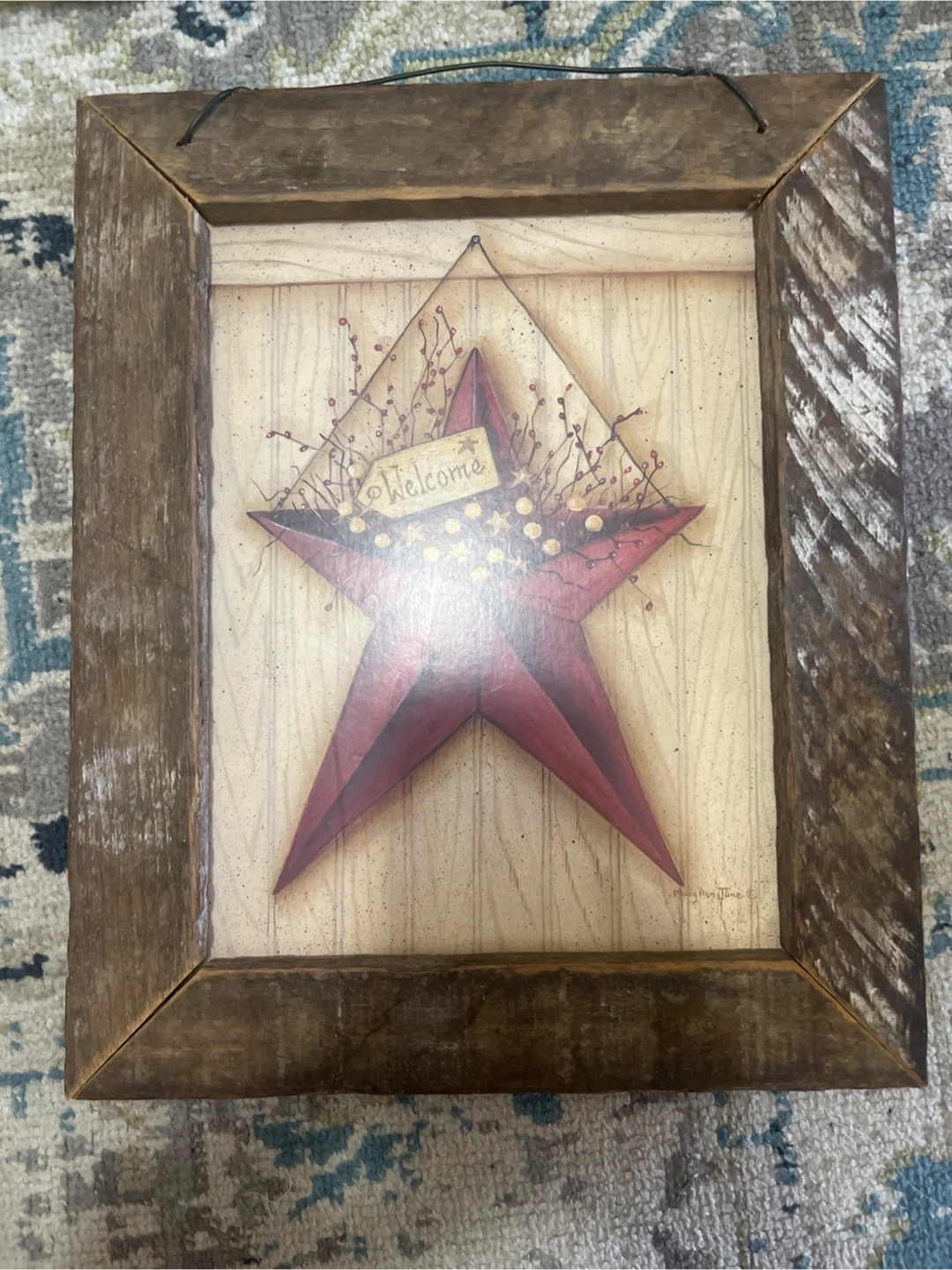 This charming wall art features a distressed red star with "Welcome" on a tag. It's housed in a rustic wooden frame, perfect for adding a farmhouse touch to your home. The art is signed by Mary Ann June.