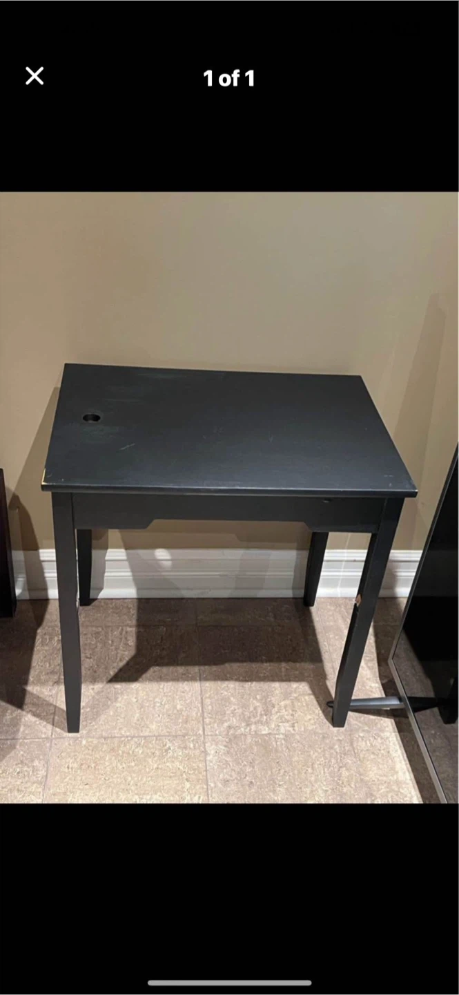 A compact black side table with a handy cable management hole. It's perfect for smaller spaces or as a simple writing surface. Made of wood composite.