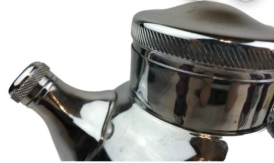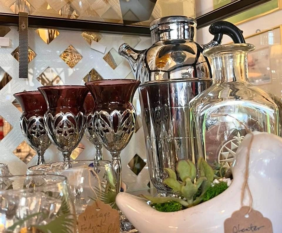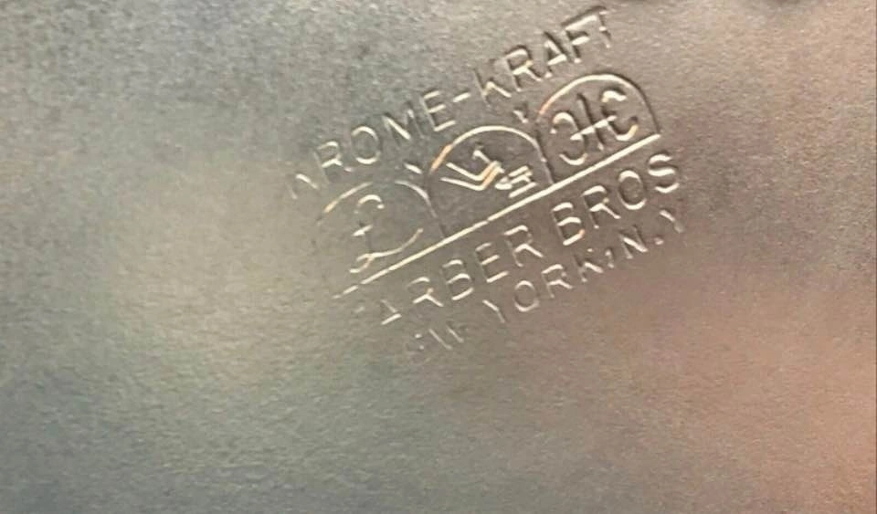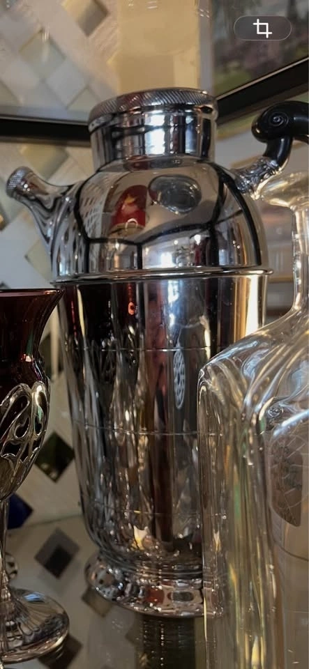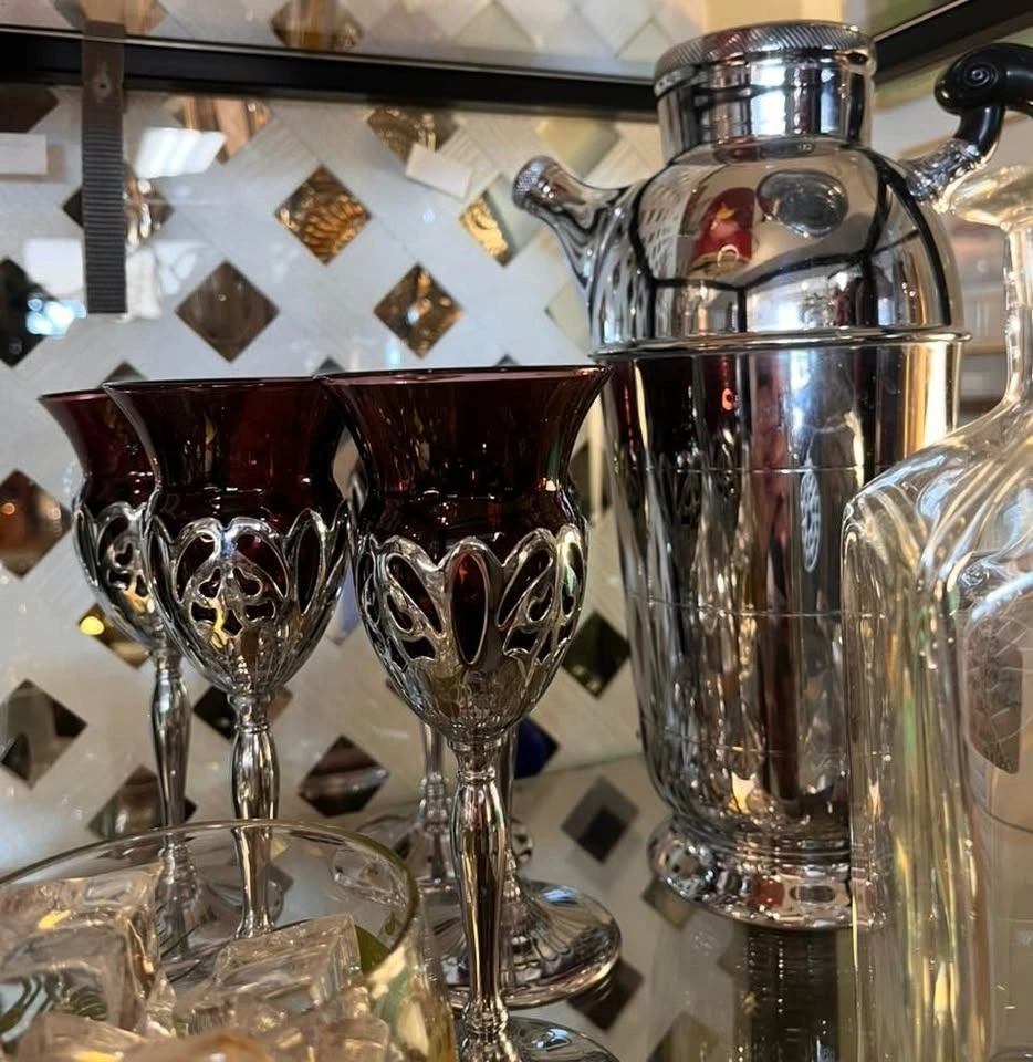 Vintage Farber Bros Cambridge Krome Kraft barware set, featuring amethyst wine stems with chrome holders and a matching cocktail shaker. The stems have removable amethyst-colored glass inserts made by Cambridge Glass Company. The chrome holders and shaker are from the Krome Kraft line, with Art Deco styling from the 1930s-1950s. These are collectible vintage barware pieces.
