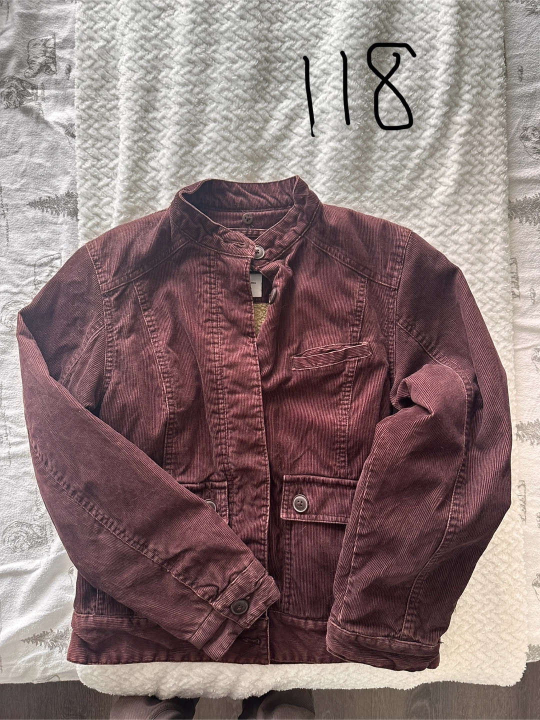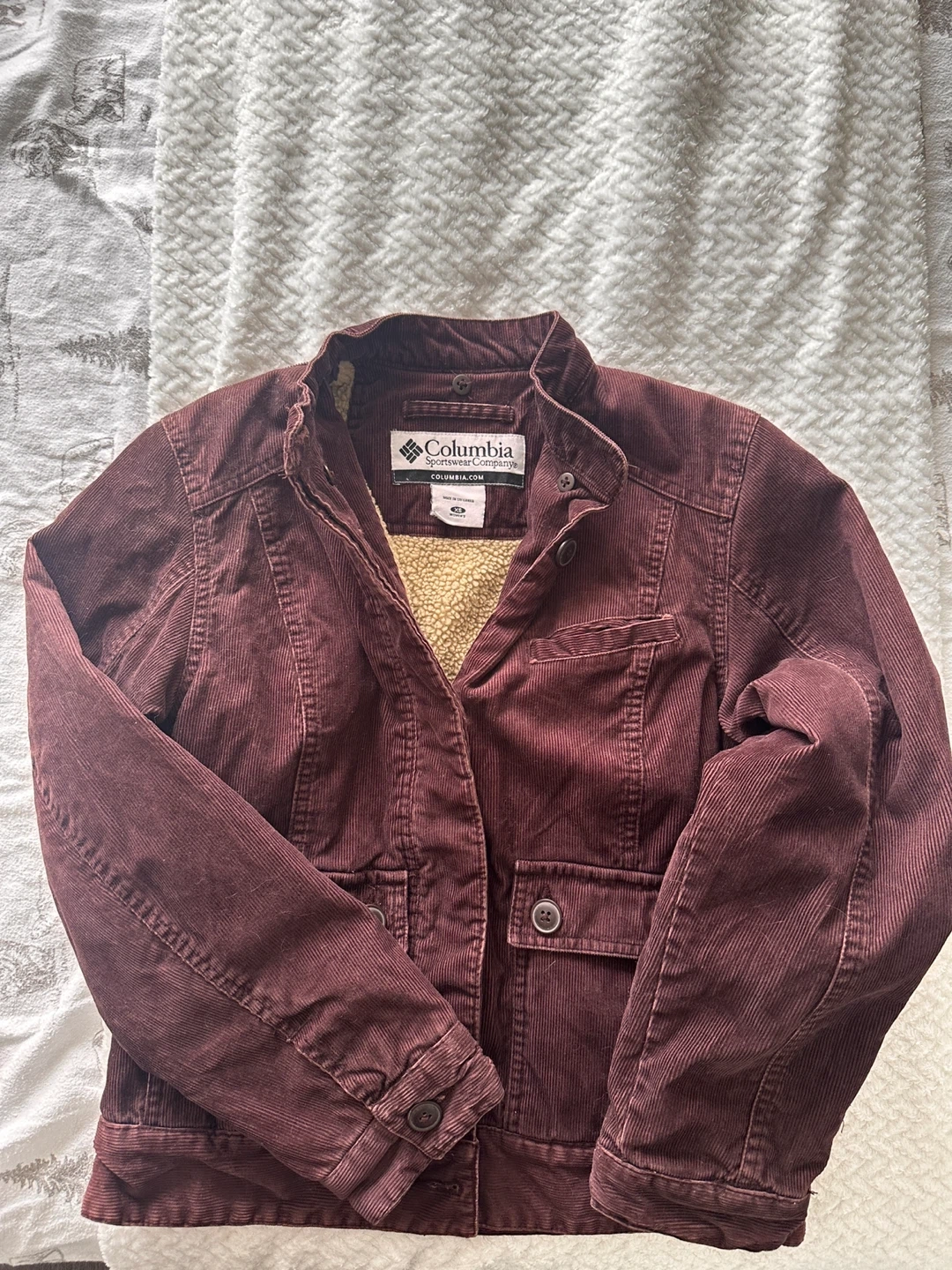 A maroon corduroy jacket from Columbia with a sherpa lining. It has a stand-up collar and button closure. Multiple pockets are present on the front.